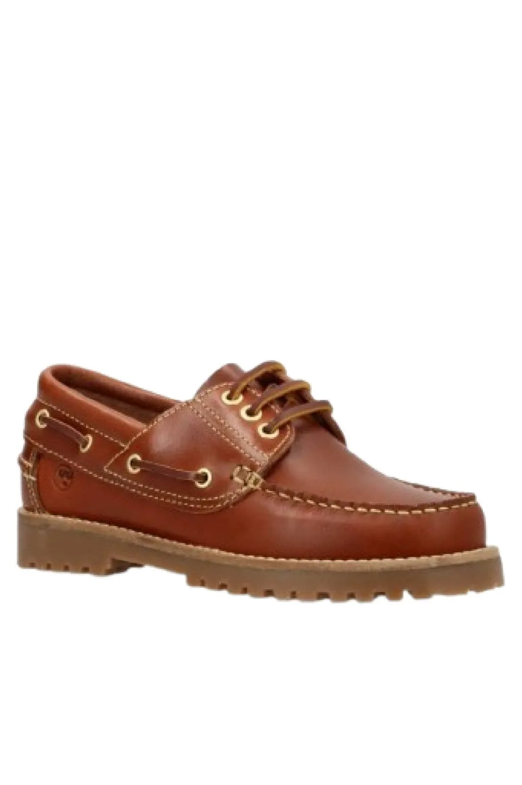 Lædersko i brandy farve med rund tå og snørebånd. Skoene har en lav hæl og er fremstillet af blødt læder med synlige syninger langs kanten.