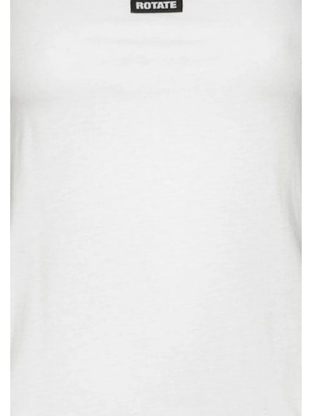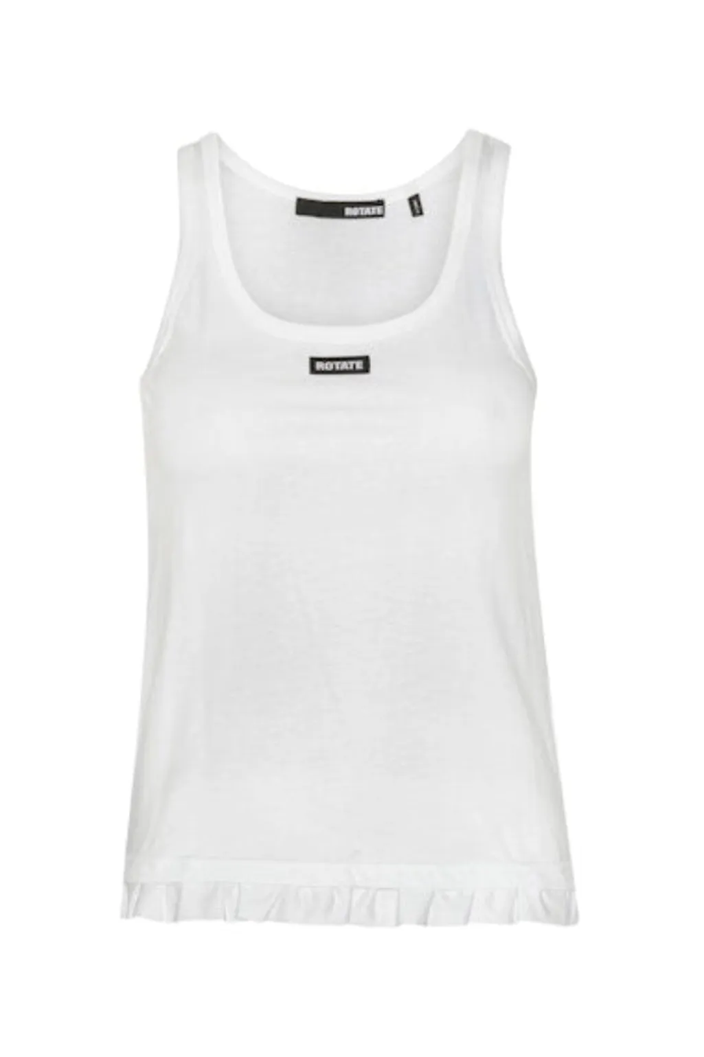 Hvid tanktop fra Rotate med rynket kant nederst. Toppen er ensfarvet og har et ROTATE-mærke på brystet. Den har et ærmeløst design.