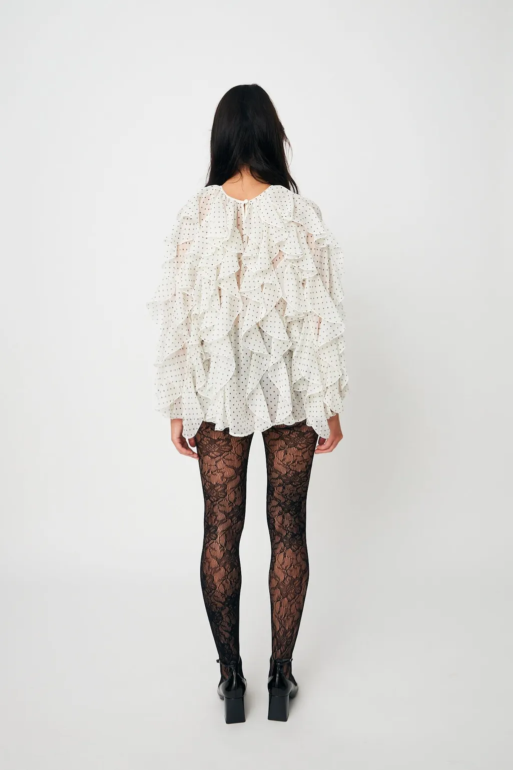Hvid bluse fra Cras med små prikker over det hele. Blusen har flere lag flæser både foran og på ærmerne, rund halsudskæring samt knapper i nakken og ved manchetterne.