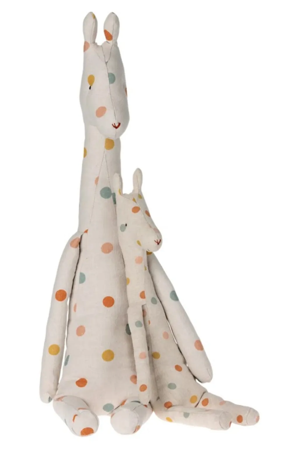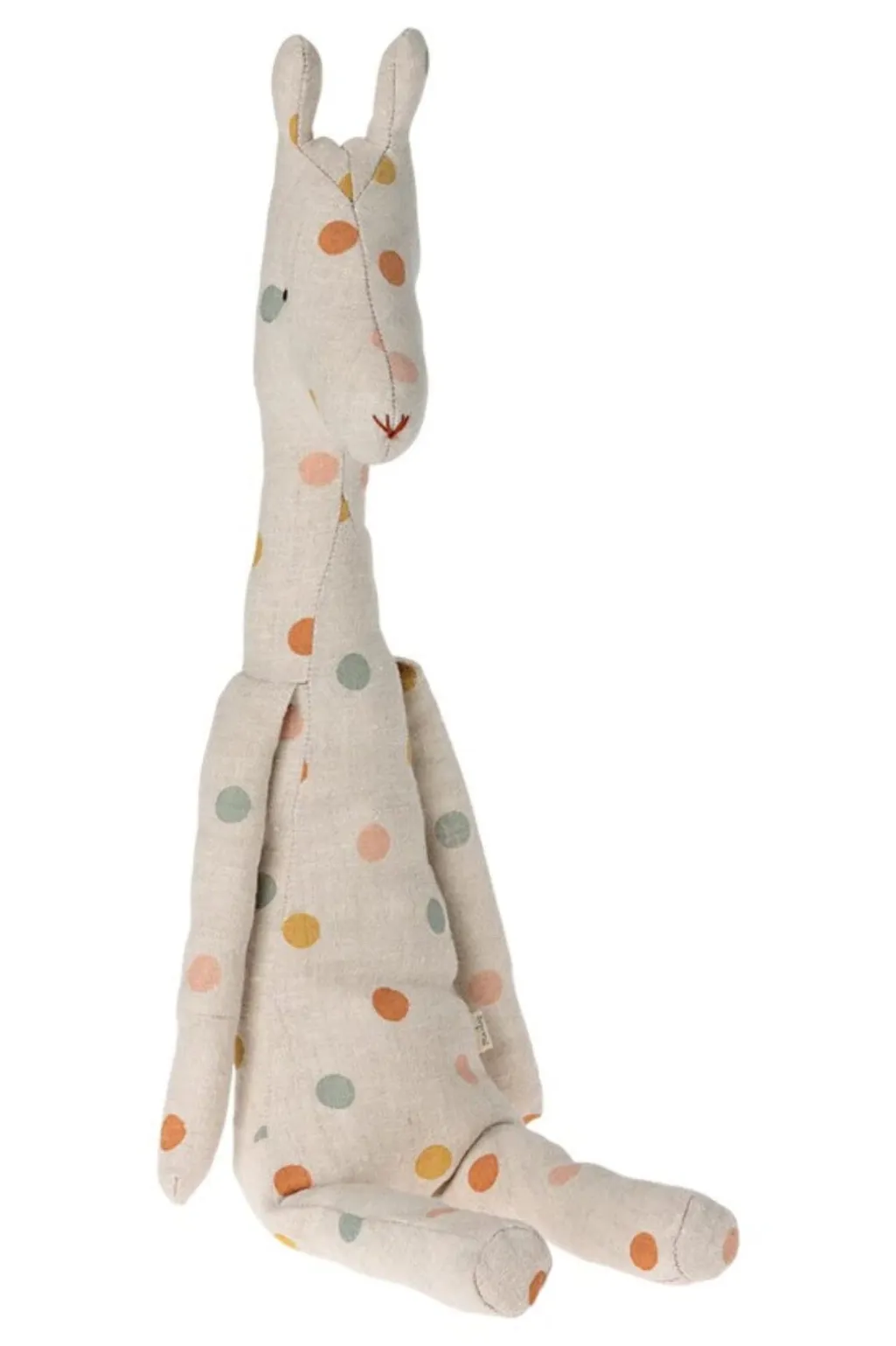 En giraf fra Maileg i mellemstørrelse. Det bløde hørstof har farverige prikker på den lyse baggrund, og giraffen har broderede ansigtstræk.