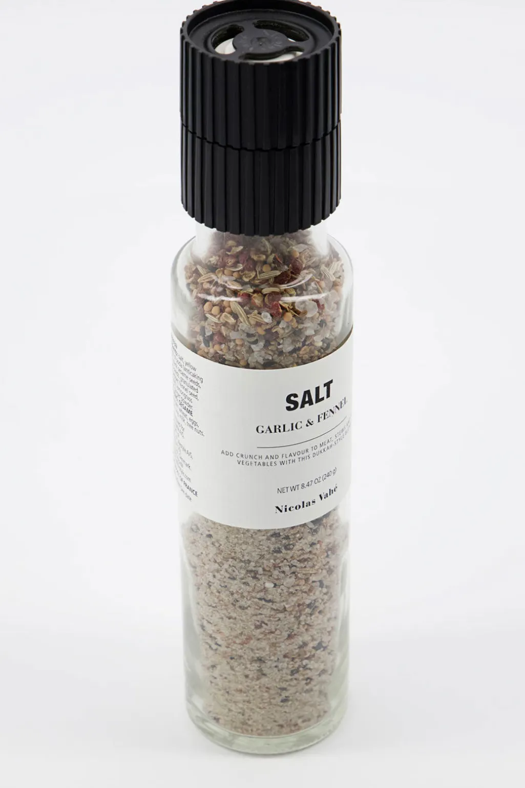 Gør dine supper og simreretter til en kulinarisk oplevelse med dette salt med hvidløg og fennikel fra Nicolas Vahé. Et hint af sort peber, anis, ingefær og citrongræs runder smagen af på eksotisk vis. Du kan også bruge det som alternativ til en dukkah, den populære krydderiblanding som puster liv i enhver ret. Med den keramiske kværn får du fint kværnede krydderier. Det frigiver olierne, så maden får endnu mere aroma og smag.
