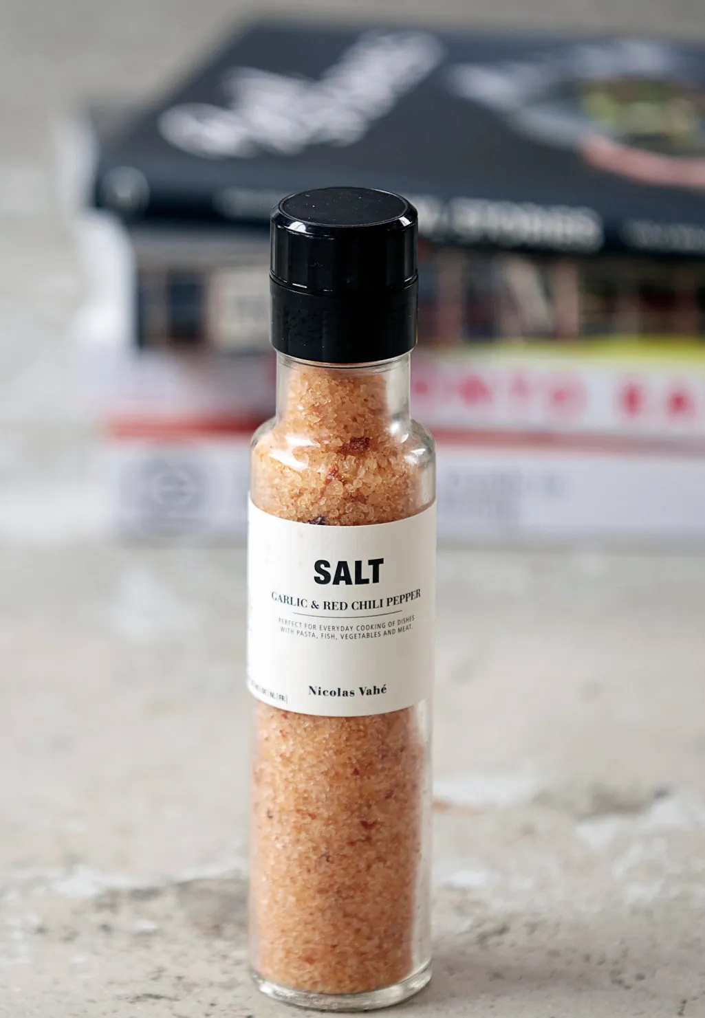 Salt med hvidløg og rød chilipeber fra Nicolas Vahe er det perfekte krydderi til alle slags kød og kommer i en smart saltkværn.