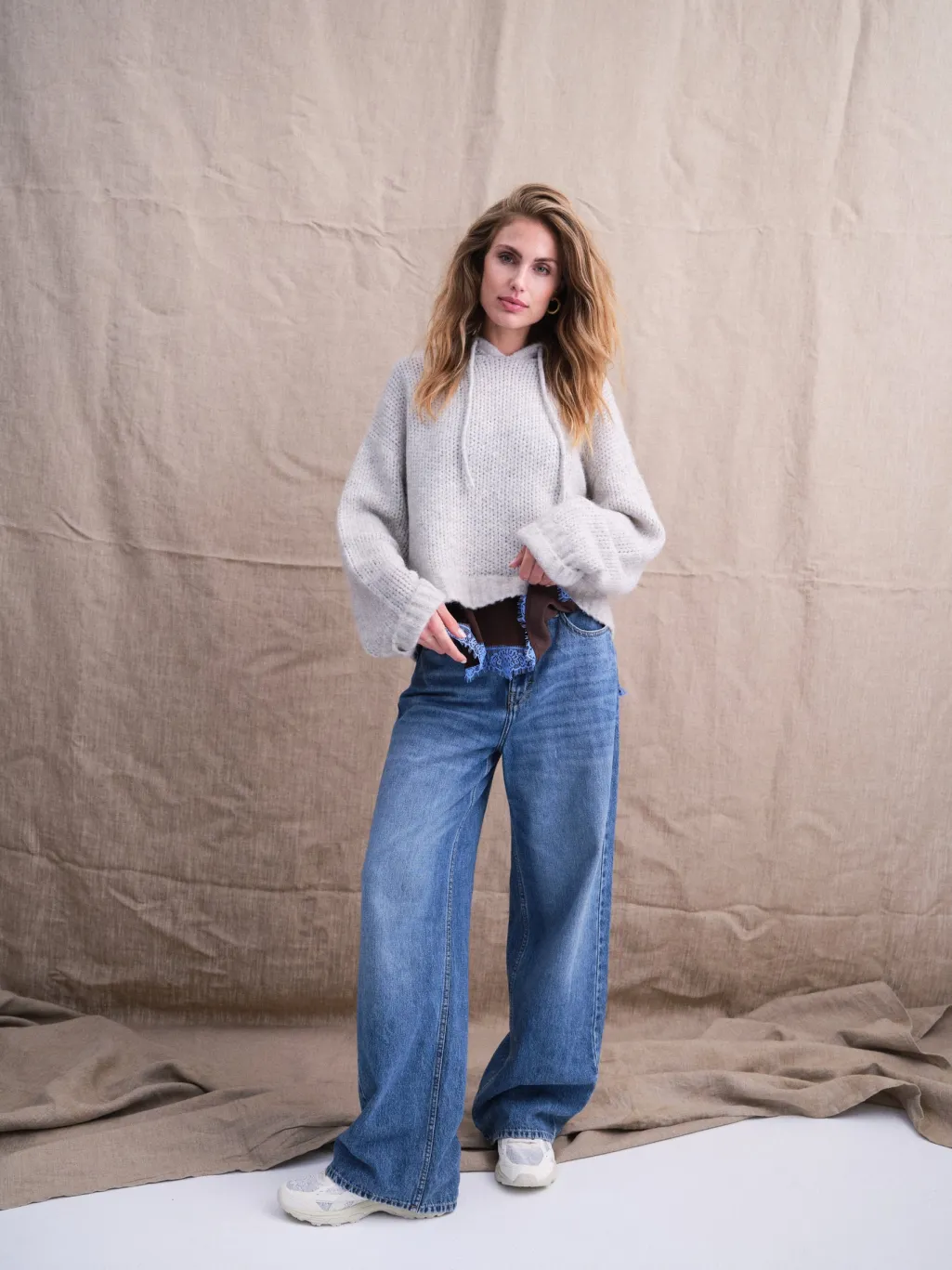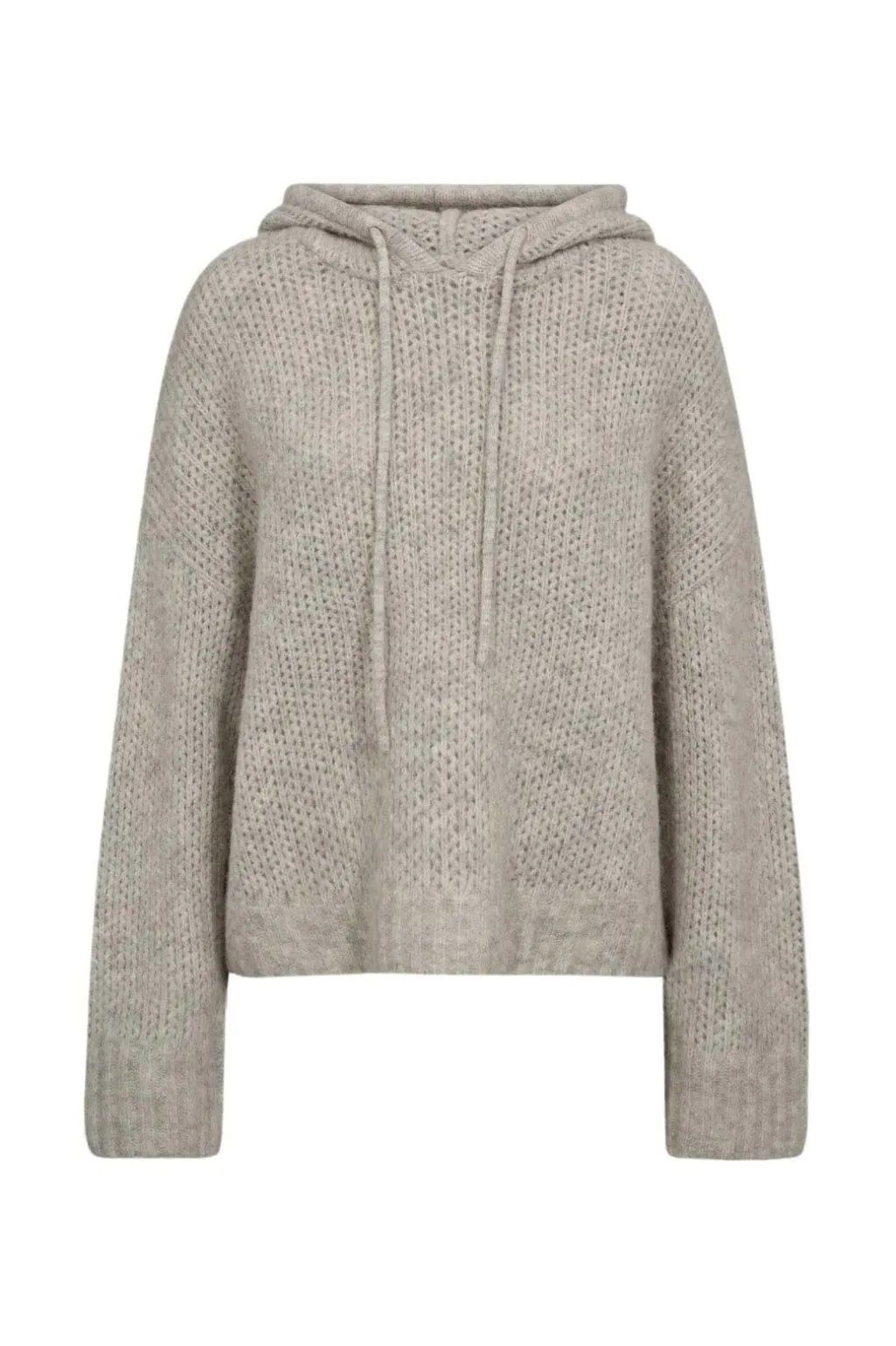 Hoodie-jumper fra Gossia i lys grå meleret farve med strikket tekstur og hætte med snoretræk.