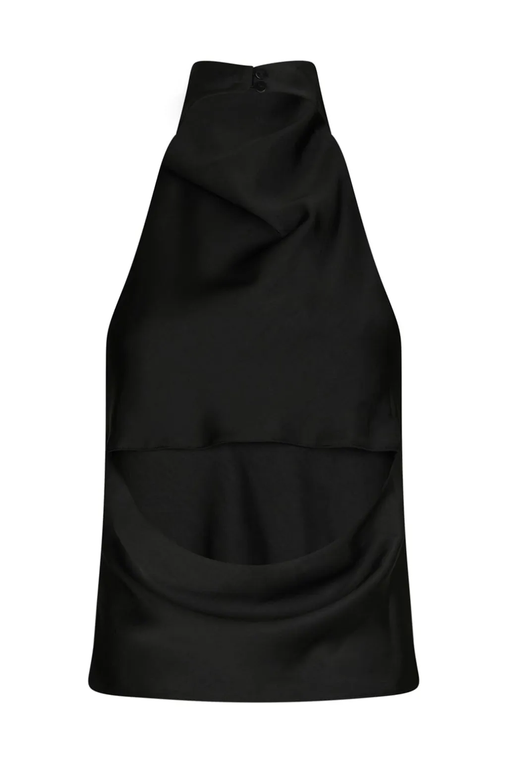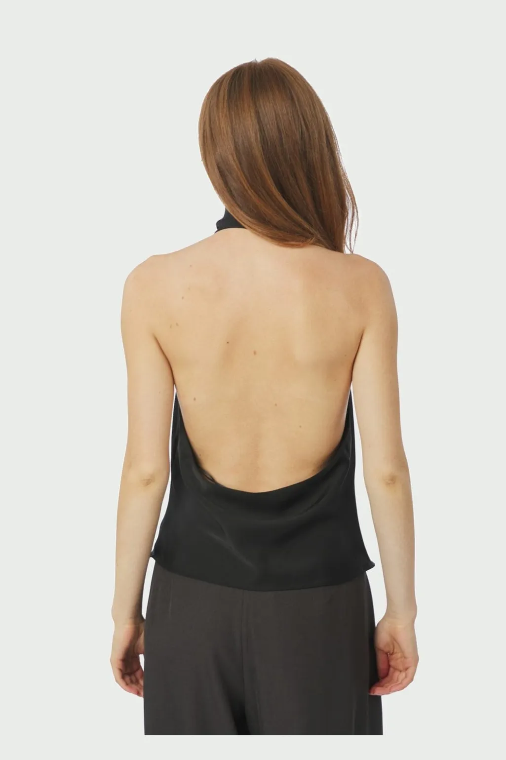 Sort satin-top fra Neo Noir med høj hals og åben ryg. Toppen er lavet i tung satin med en blank overflade og knapper som lukning.