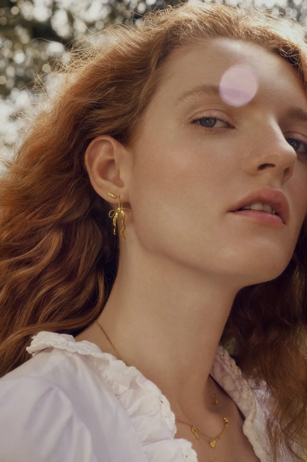 Guldbelagte øreringe fra Maanesten med et sløjfeformet design. Øreringene har bølgende bånd, der skaber en dynamisk form i gylden farve.