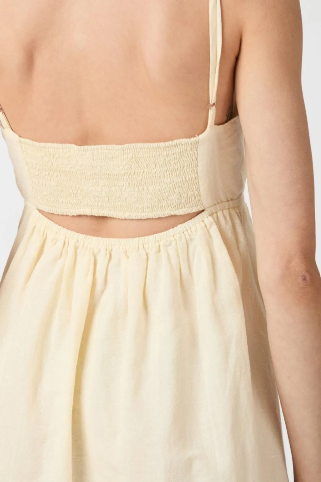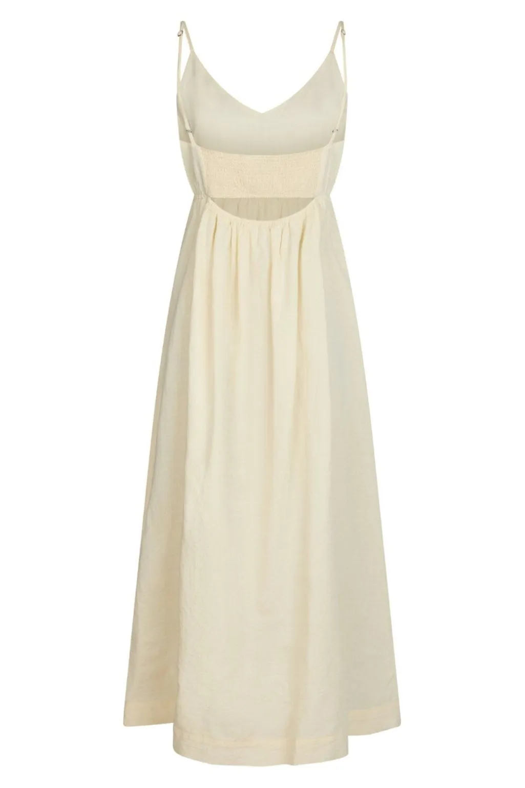 Lang hørkjole fra Neo Noir i lys gul. Kjolen har tynde stropper, V-udskæring og smock-detalje på ryggen. Længden når til midt på læggen.