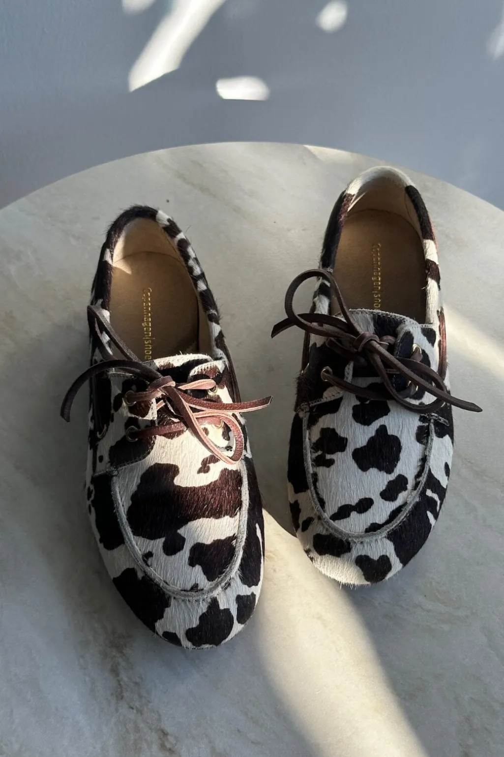 Ruskindsko fra Copenhagen Shoes med sort-hvidt dyreprint og brun sål. Skoen har en rund tå og snørebånd i brun farve.