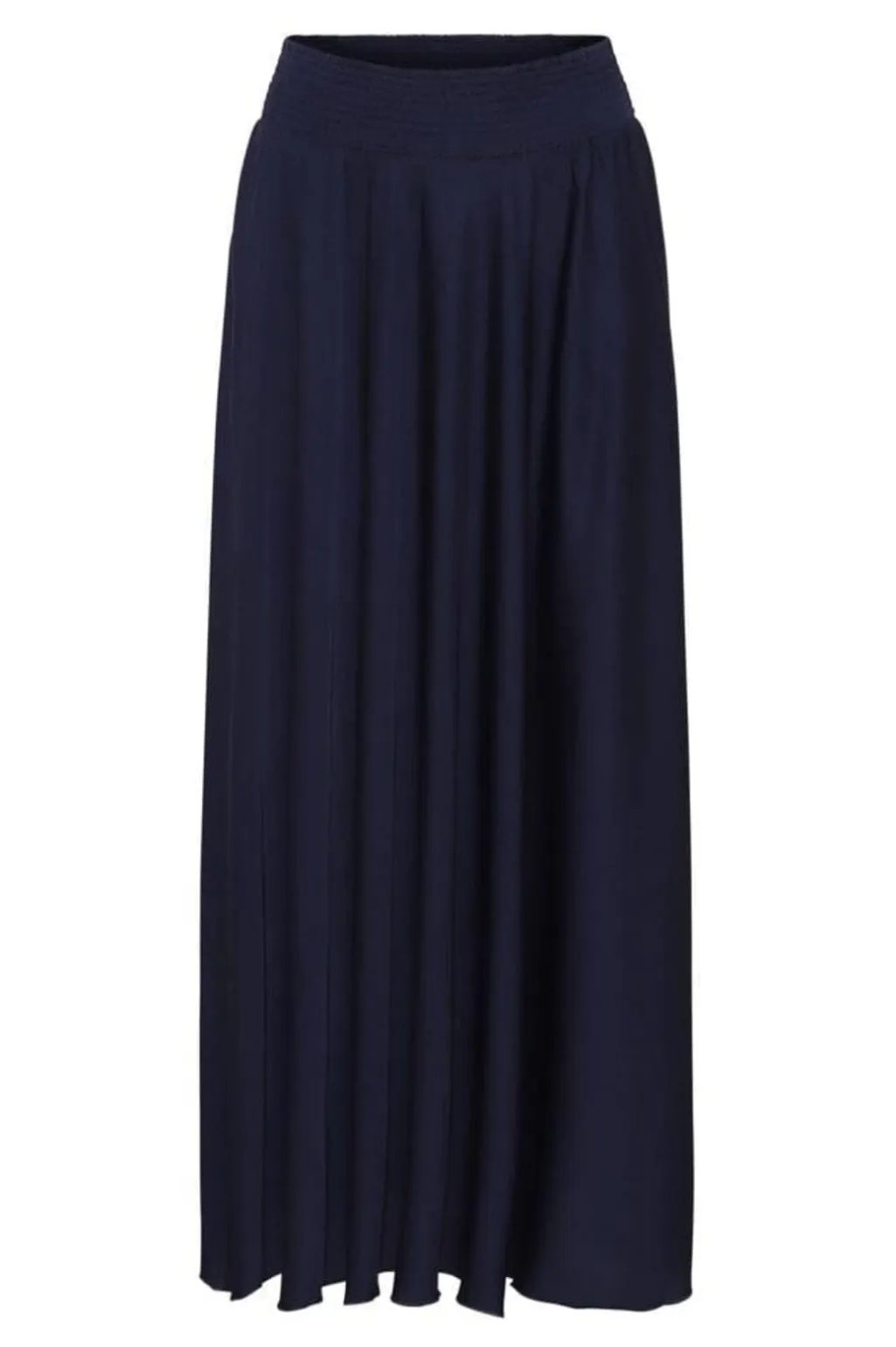Mørkeblå nederdel fra Karmamia i blødt stof med flæser. Nederdelen går til gulvet og har elastik i taljen.