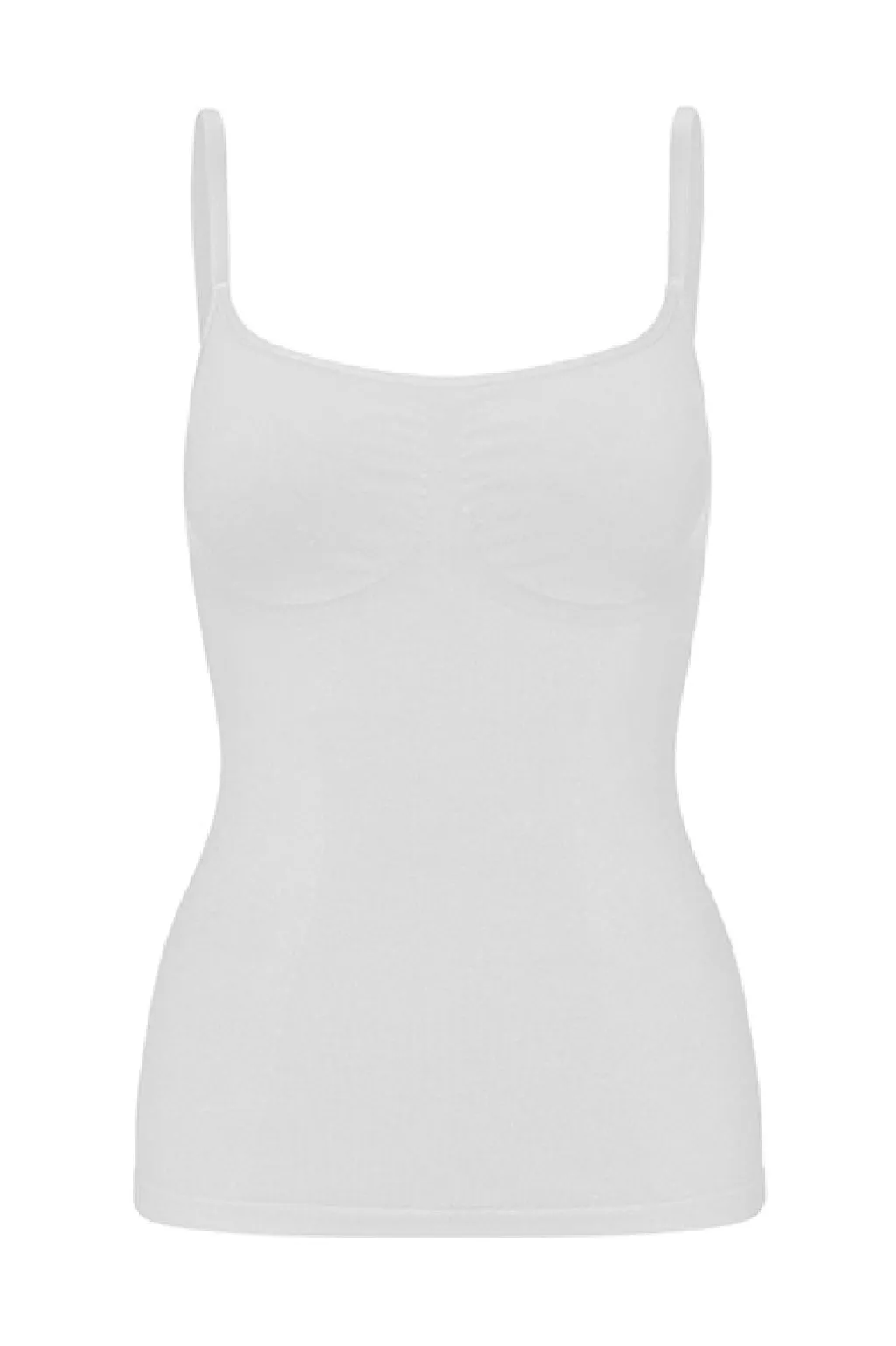 Hvid cami-top fra Lykkeland Ateliér med indbygget støtte og kompressionszoner. Toppen passer til både hverdagen, aktiviteter og hjemmet.