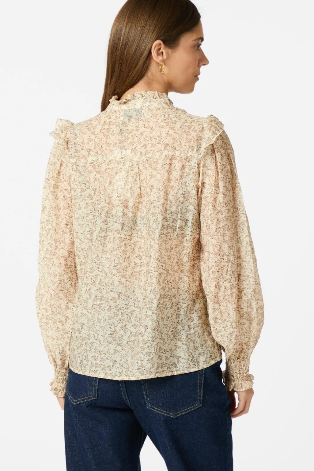 Blomstret bluse fra Neo Noir i off-white med beige nuancer. Blusen har en V-halsudskæring med flæser ved skuldrene og lange ærmer med smockdetaljer ved manchetterne.