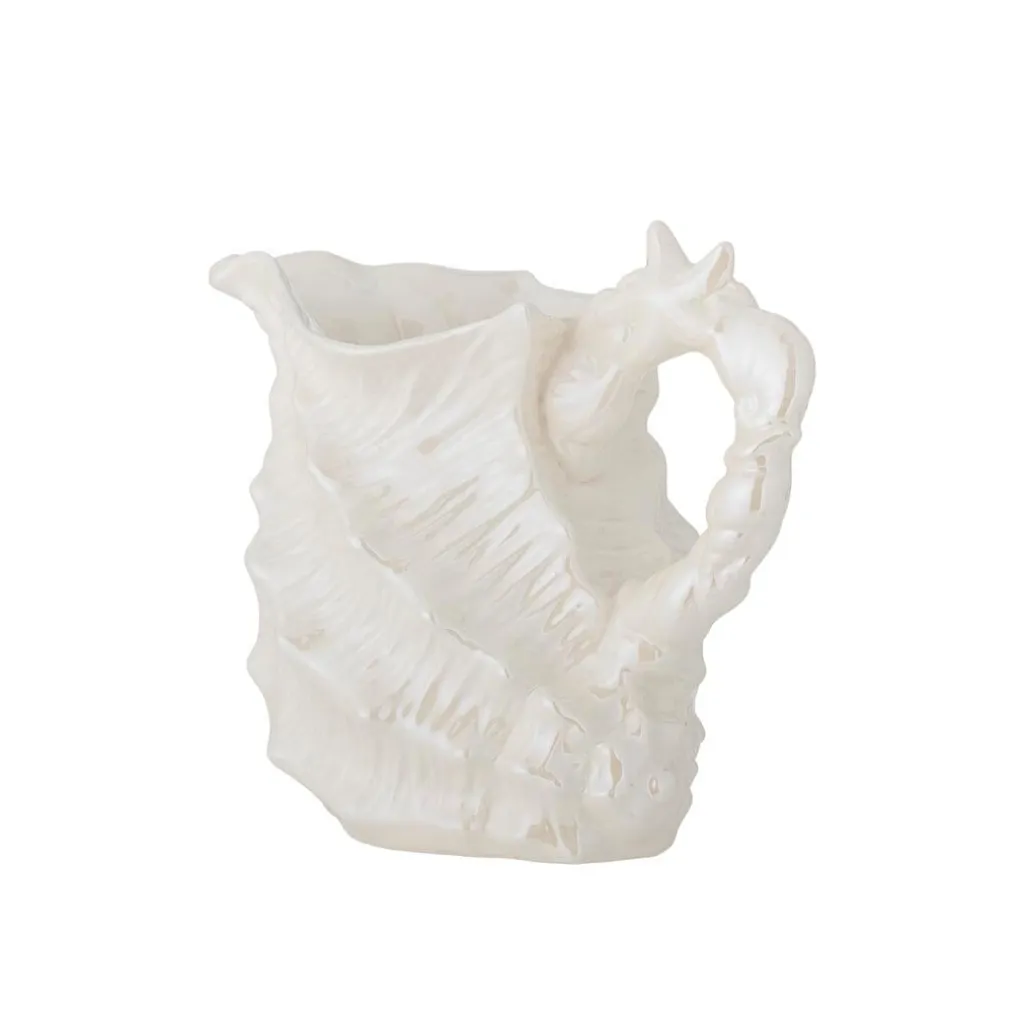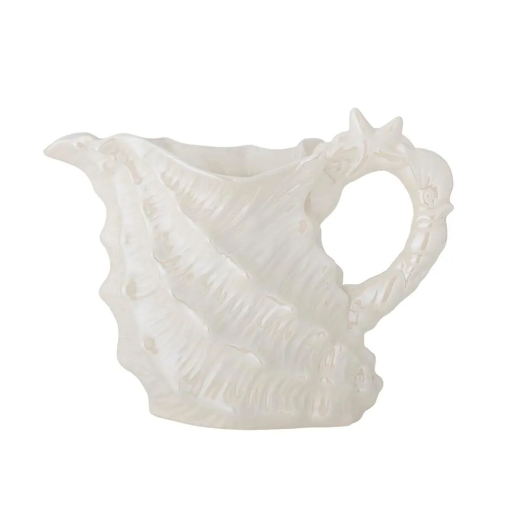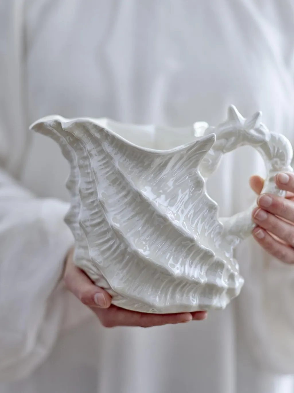 Hvid kande fra Bloomingville, lavet af stentøj med en muslingeskalsform. Overfladen er bølget og blank, og hanken har detaljer med muslinge- og søstjernemotiver.