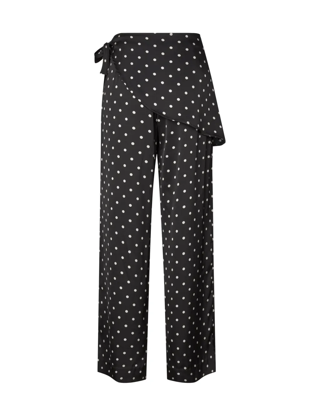 Sorte bukser fra MbyM med hvide prikker. Bukserne har bindebånd i taljen og en asymmetrisk overdel. De går til anklen og har en løs pasform.