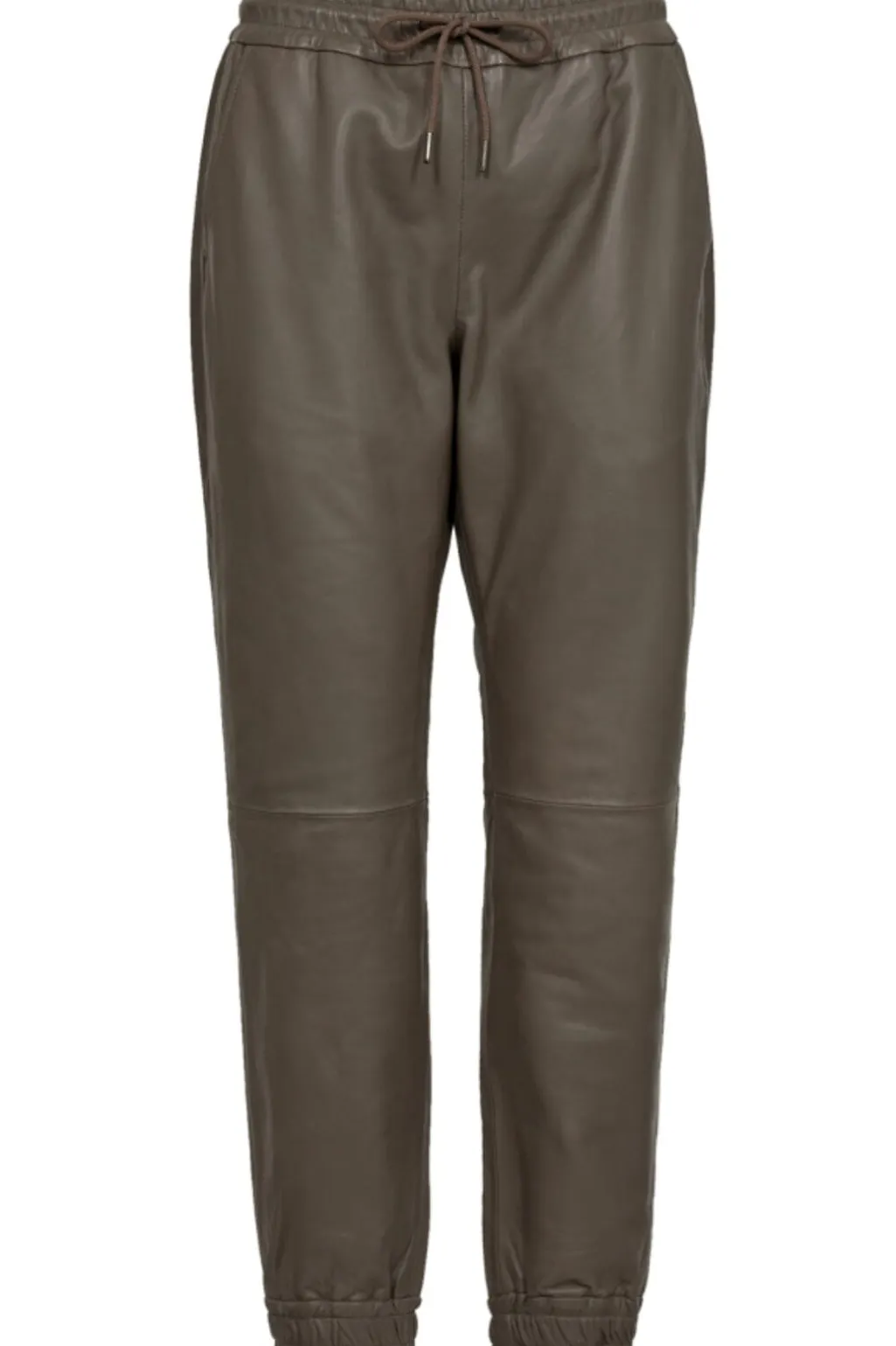 Læderbukser fra Co´couture i farven Elephant. Bukserne har en afslappet jogger-stil med elastik og snøre i taljen samt elastiske manchetter ved anklerne.