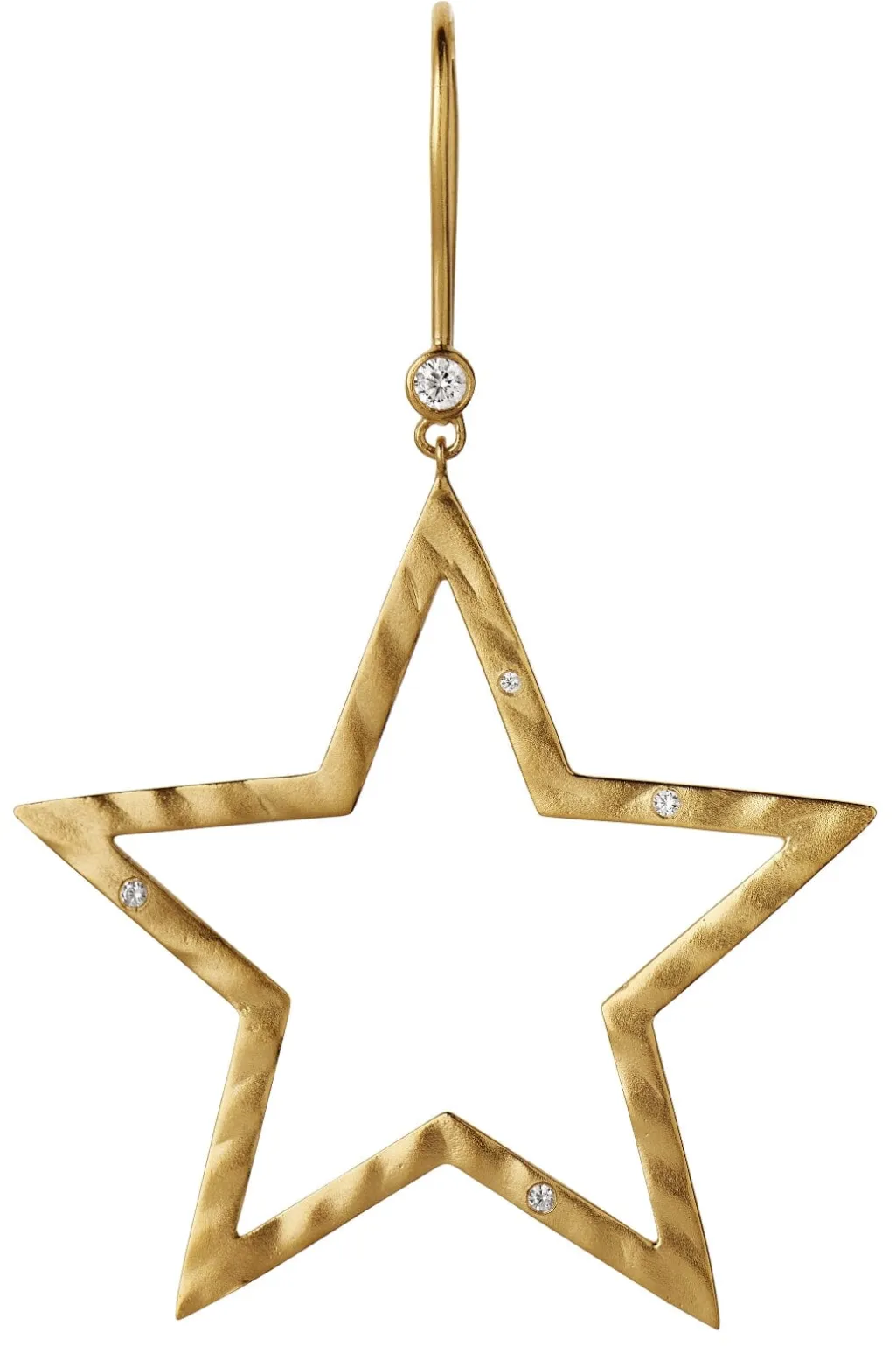 Gylden ørering fra Stine A i stjerneform. Den har en prikket overflade med små klare sten langs stjernens kanter og en cirkulær sten øverst.
