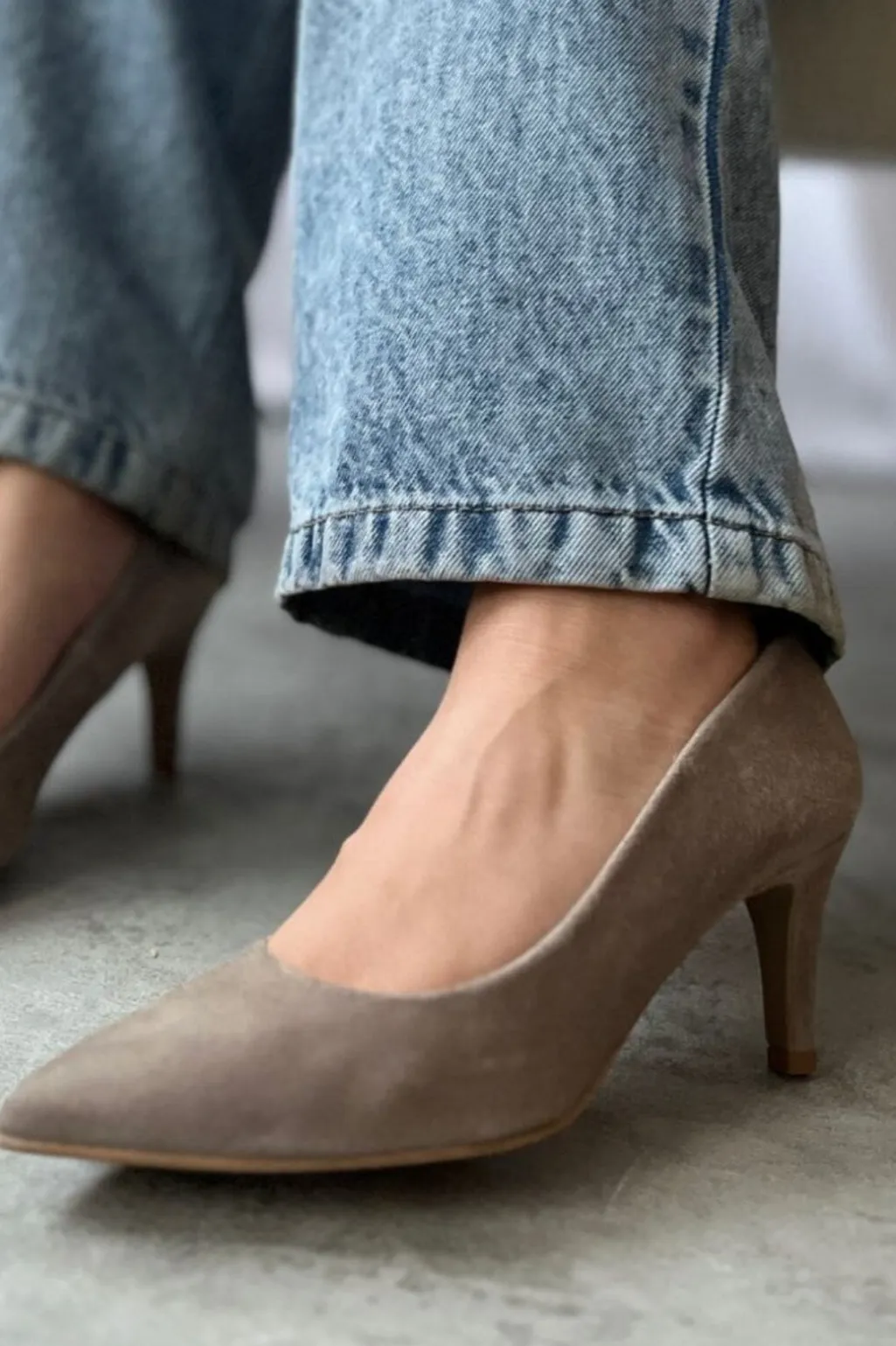 Beige stiletter i ruskind og læder med spids tå og 7 centimeter hæl. Skoen har en fleksibel gummisål og bløde skumindersåler.