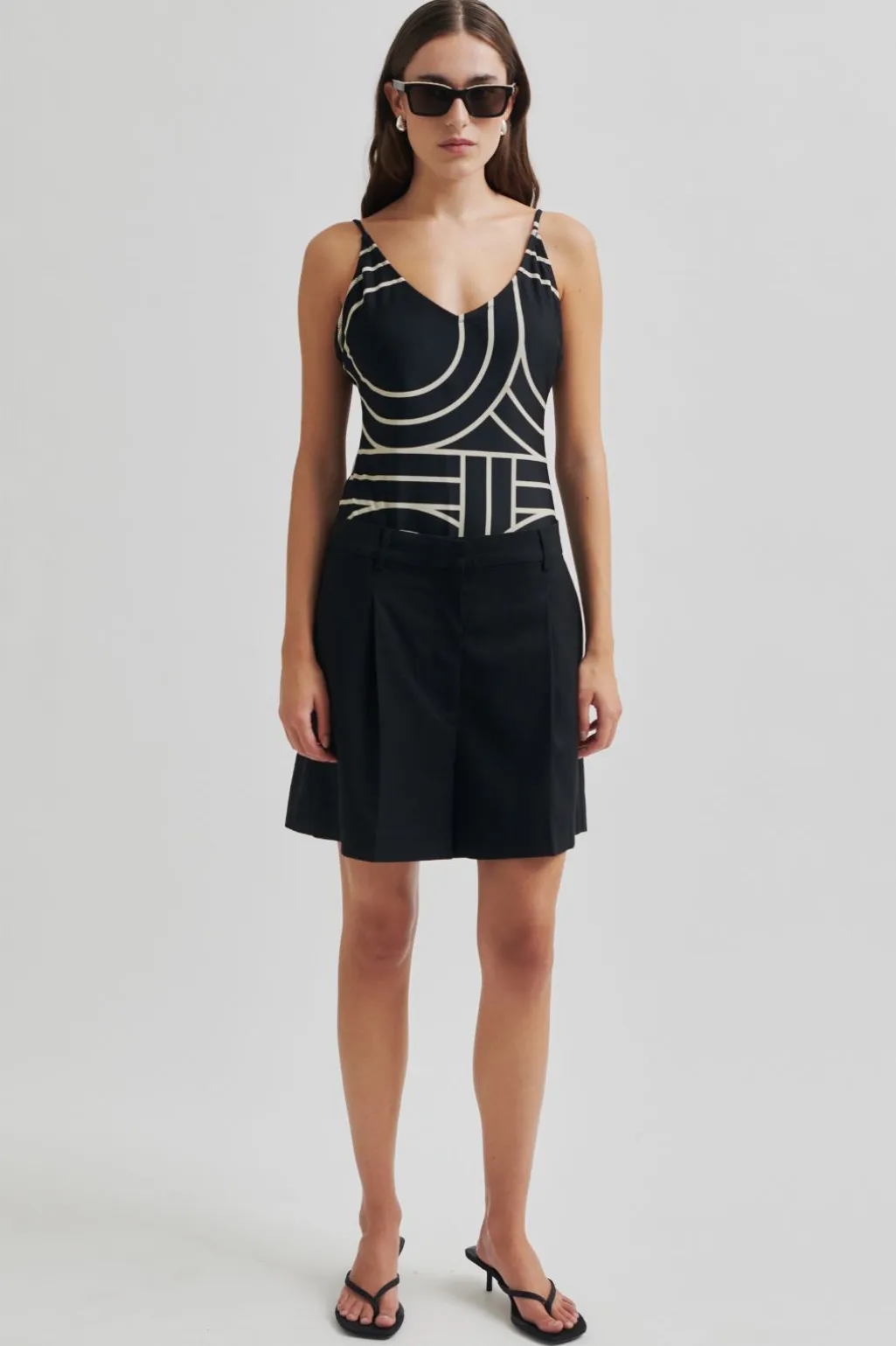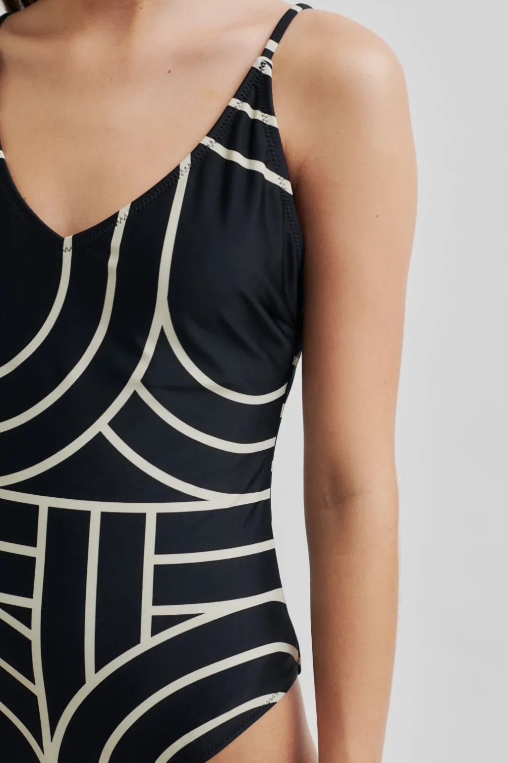 Sort badedragt fra Second Female med et grafisk mønster i lyse kontrastlinjer. Den har en V-udskæring og justerbare stropper, der giver mulighed for at tilpasse pasformen.