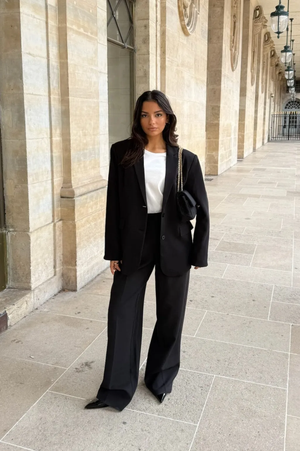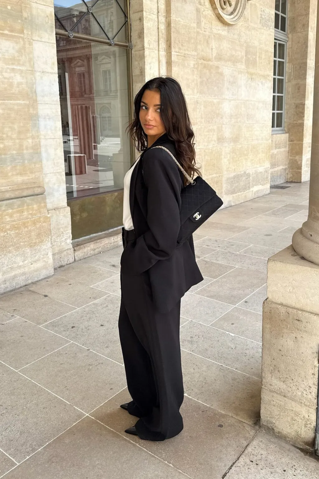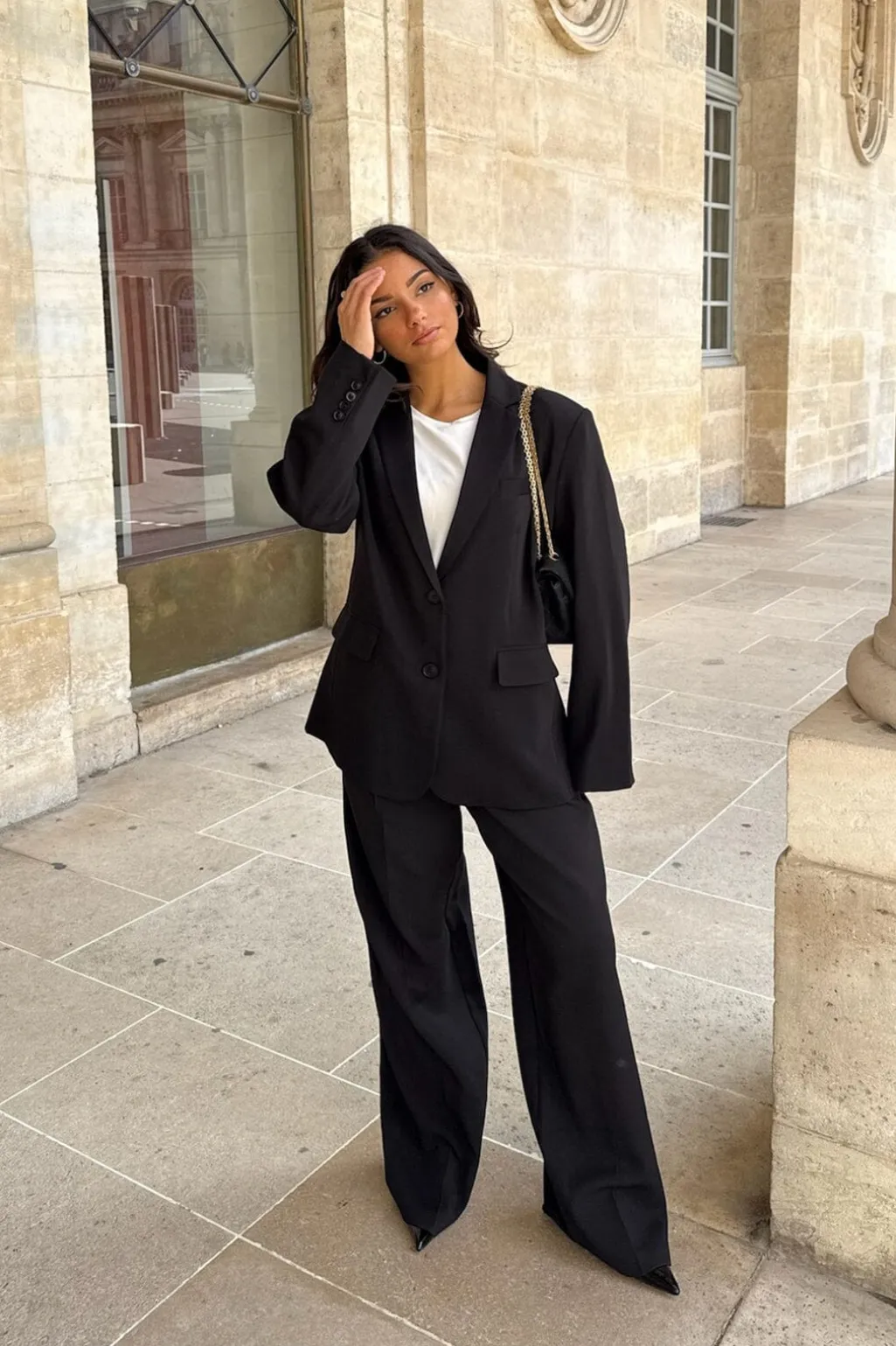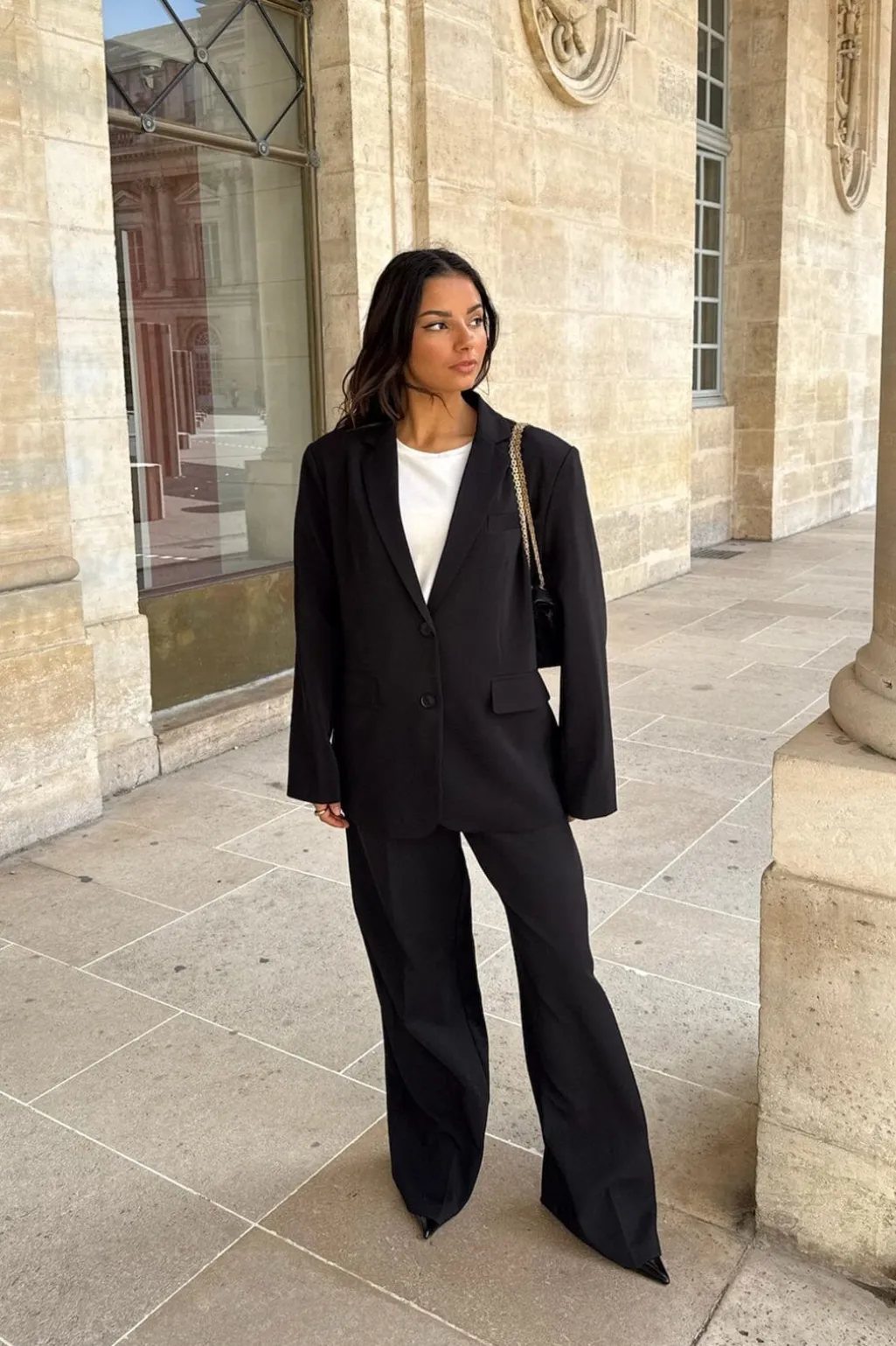 Sort blazer fra BYIC med skjortekrave og to knapper foran. Den har lige pasform, lange ærmer og praktiske lommer – en brystlomme og to flaplommer nederst på blazeren.
