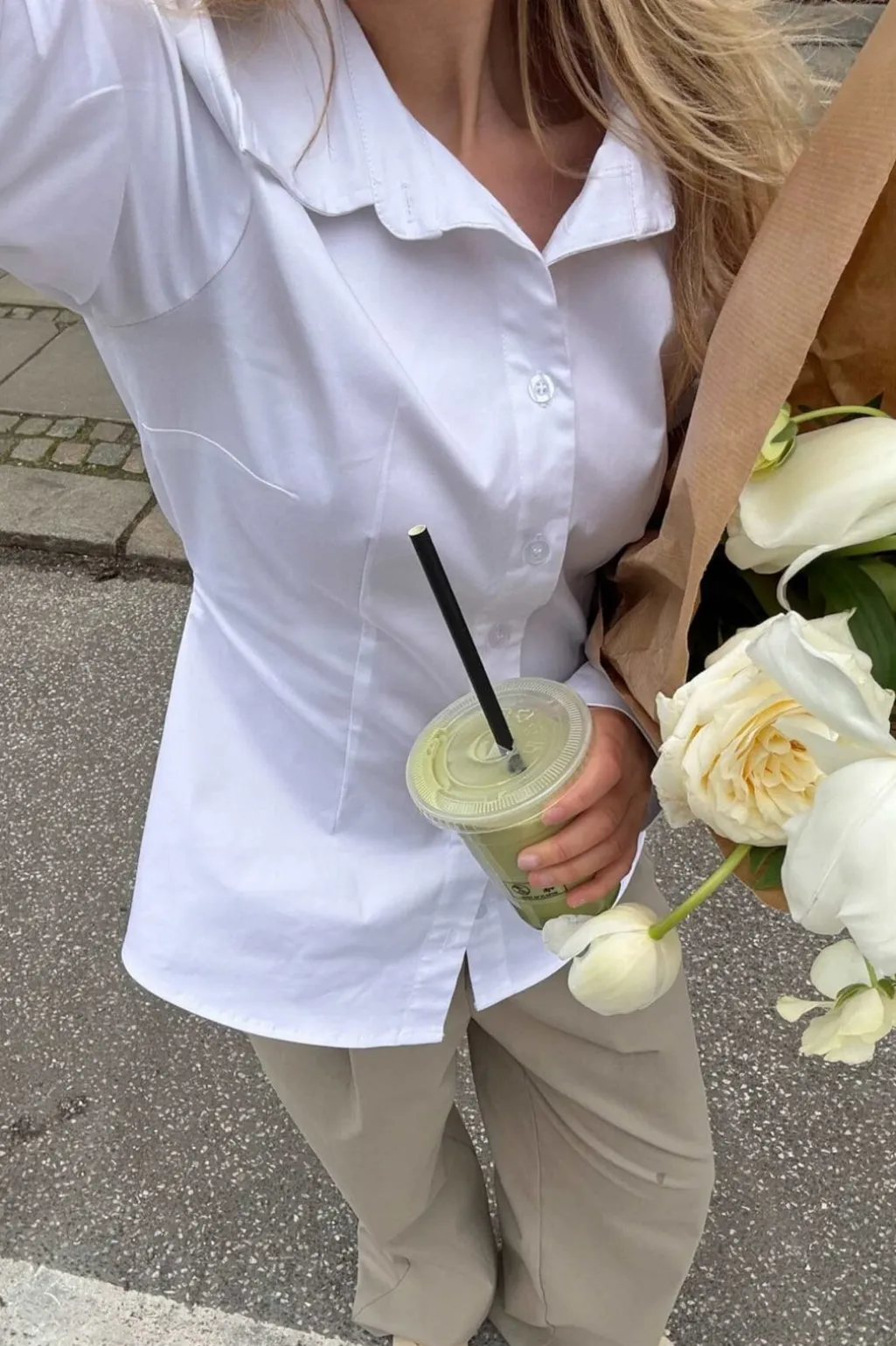 Hvid skjorte fra BYIC med klassisk skjortekrave og store manchetter. Skjorten har syninger i taljen og et justerbart bånd på ryggen for en personlig pasform.