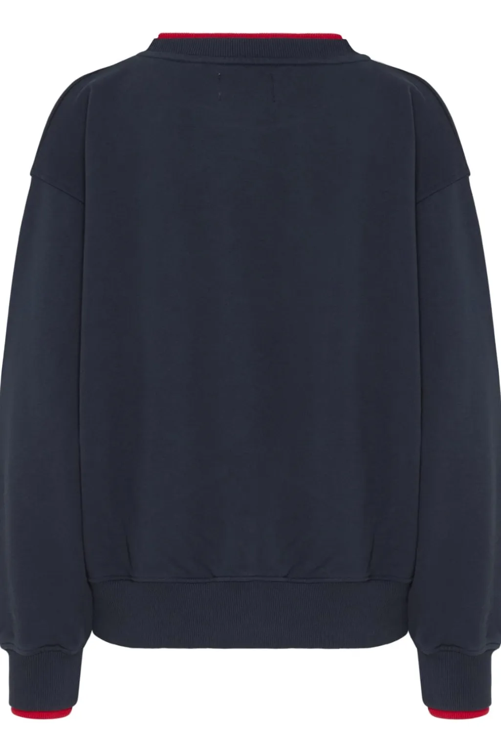 Navyblå sweatshirt fra Ball med røde detaljer ved halsen og ærmerne. Den har et stort rødt BALL-logo på fronten med teksten THE JEANS under.