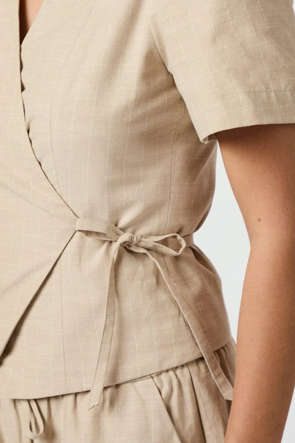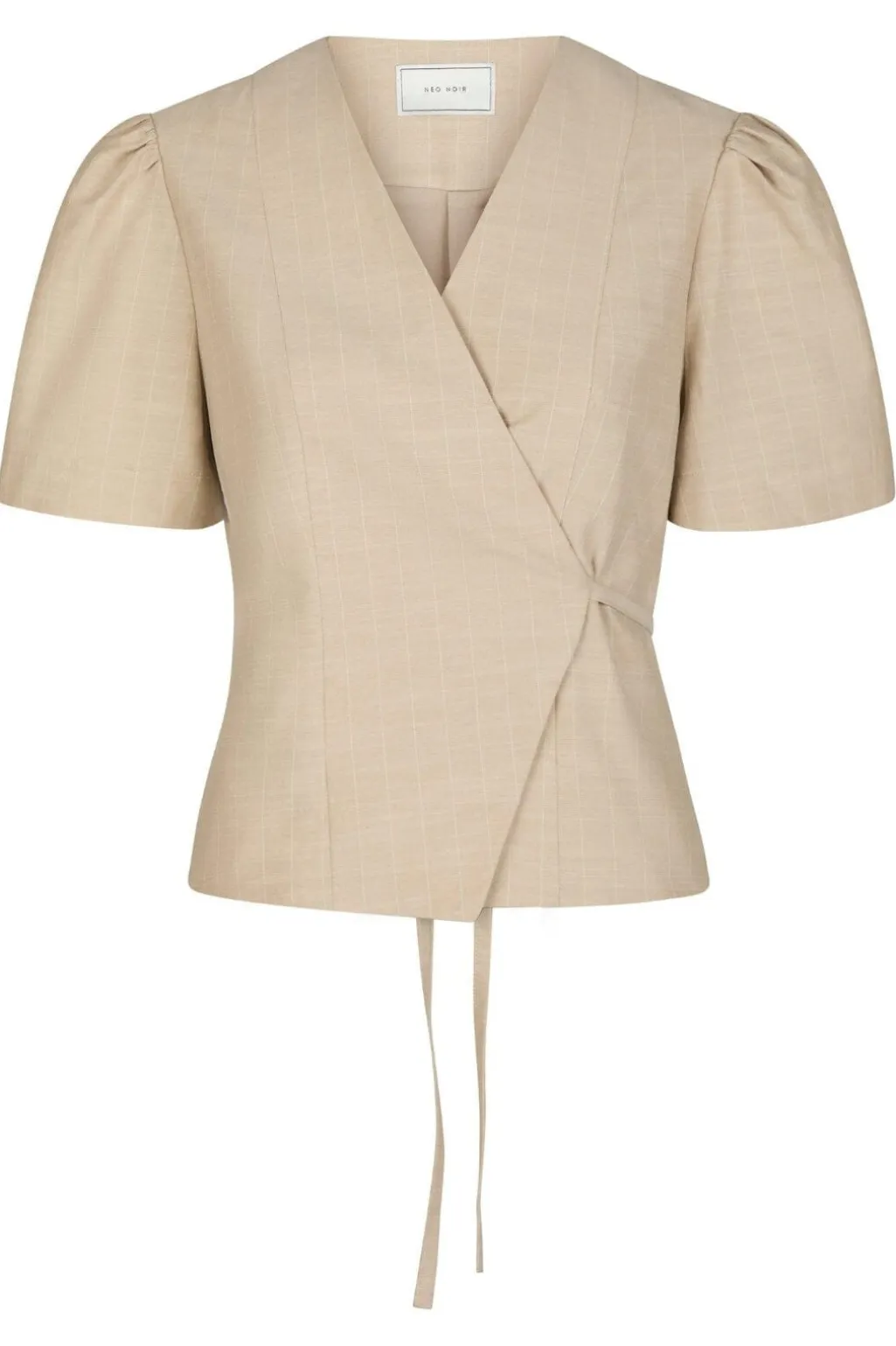 Sandfarvet slå-om-bluse fra Neo Noir med stribedetaljer. Blusen har korte pufærmer og en V-udskæring. Bindebåndet i siden giver mulighed for at tilpasse pasformen.