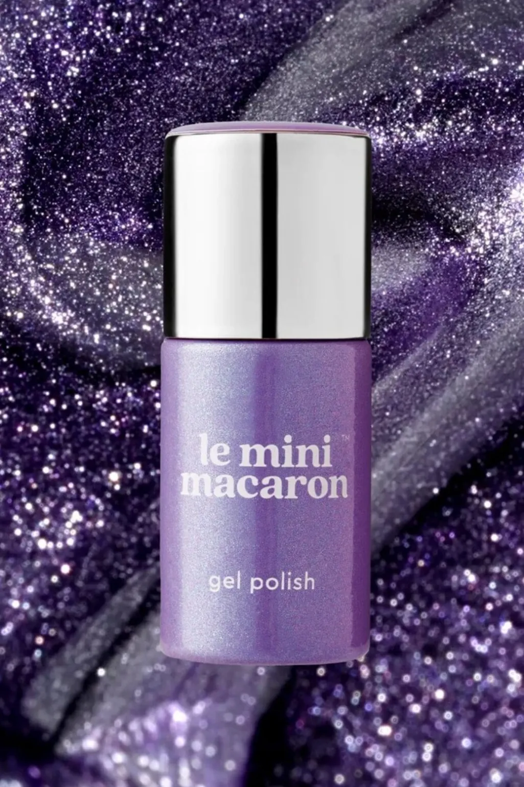 Gelpolish fra Le Mini Macaron med magnetisk katteøjeeffekt i farven Lavender Haze, en lilla nuance med sølvglitter.