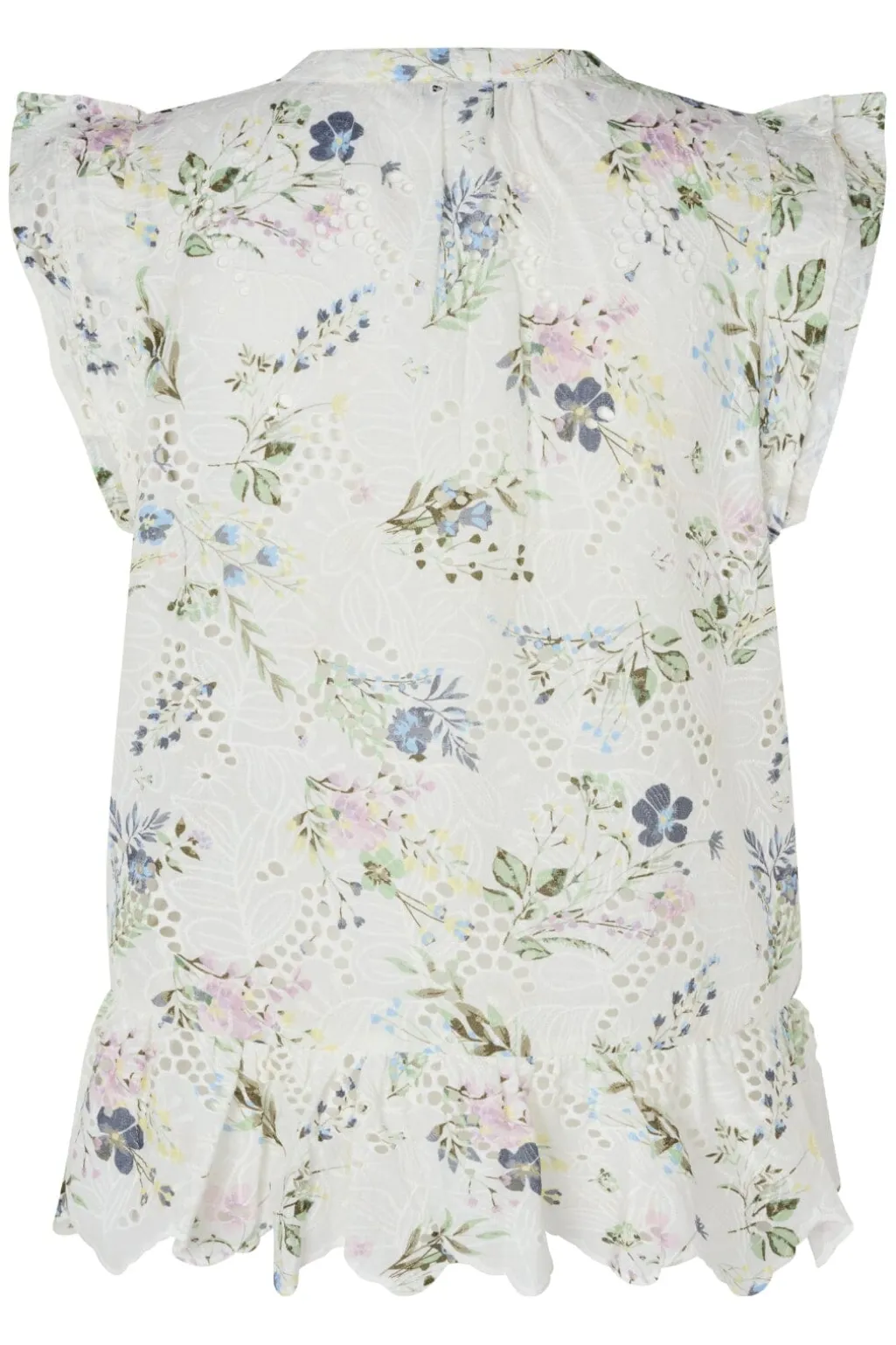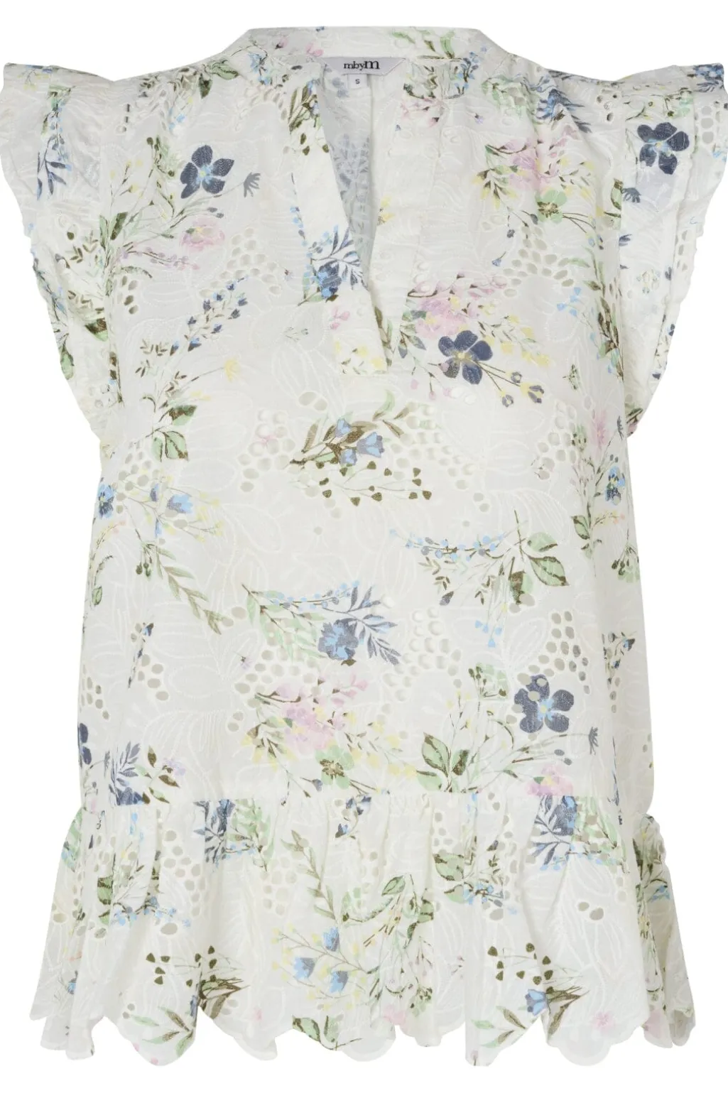 Ærmeløs top fra MbyM med peplumkant og flæsedetaljer. Det blomstrede mønster i pink og blå på hvid baggrund giver toppen et friskt udtryk. V-halsudskæringen og de bløde flæser skaber et feminint design.