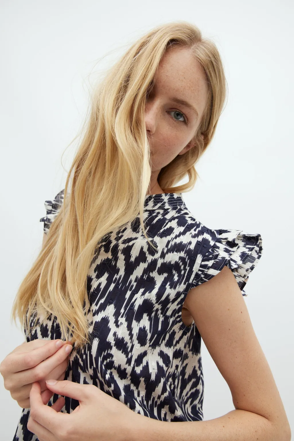 Bluse fra MbyM i mørkeblå og hvid med ikat-inspireret print. Den har flæsedetaljer ved ærmerne og en v-udskæring med knapper foran.
