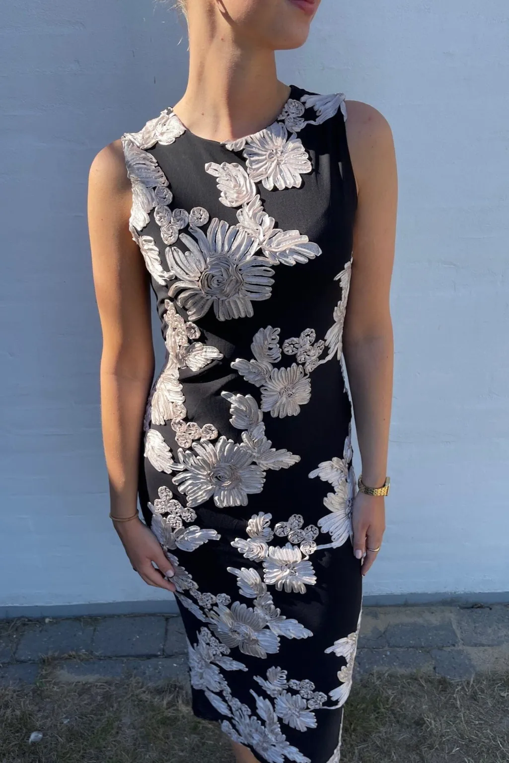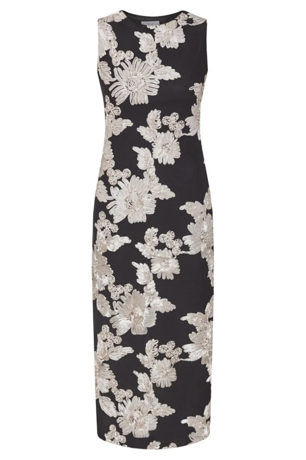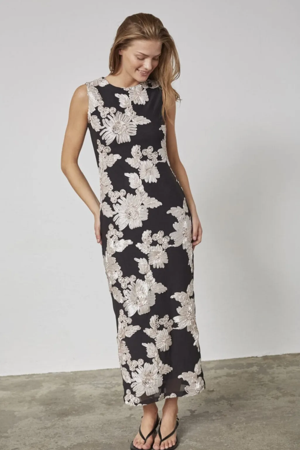 Sort kjole fra Sisters Point med broderede blomstermotiver i champagnefarve. Kjolen er ærmeløs og har en figursyet silhuet, der går til anklerne.