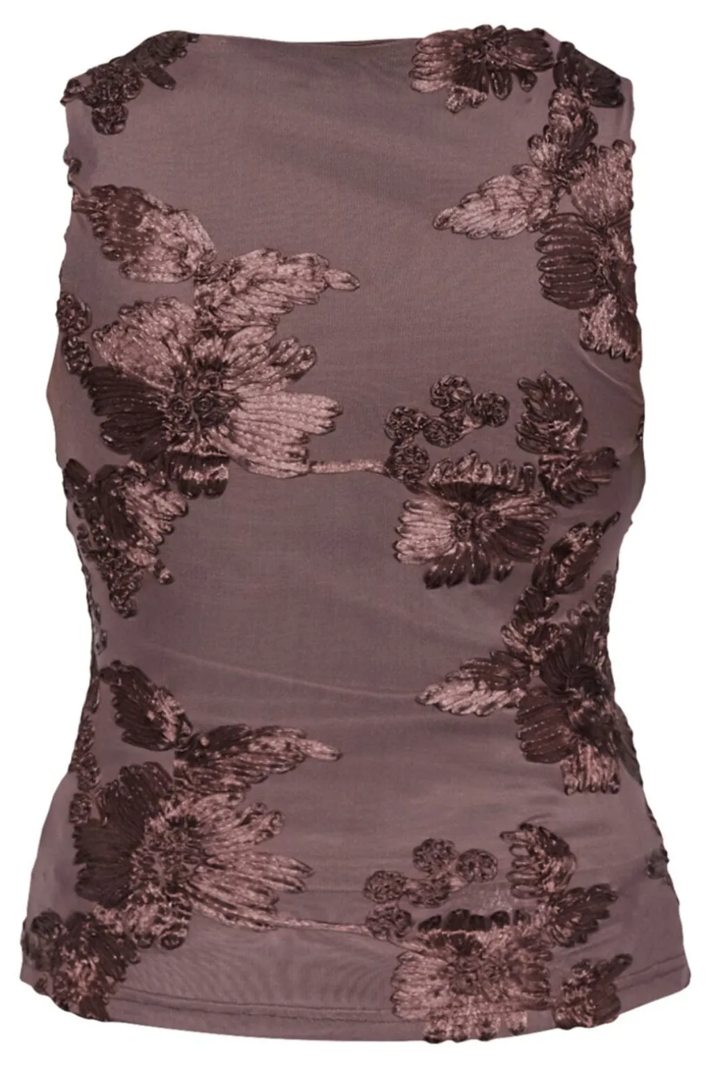 Brun top fra Sisters Point, lavet af en polyester-elastanblanding. Toppen har broderede blomstermotiver og er uden ærmer.