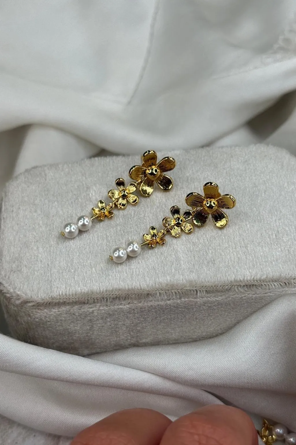 Øreringe fra Molly&My Jewellery, lavet af rustfrit stål med en forgyldt finish. Designet har guldfarvede blomster i forskellige størrelser.