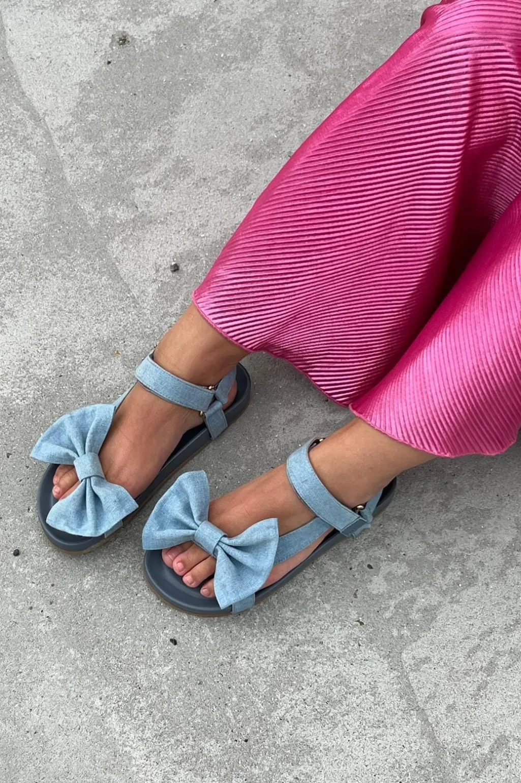 Jeansblå sandaler fra Copenhagen Shoes med store sløjfer i denimlook. Sandalerne har en blød indersål af latexskum og en stødabsorberende gummisål.