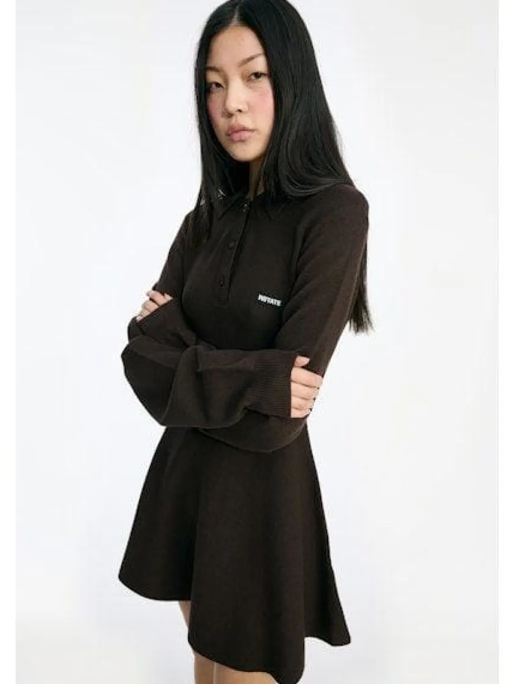 Strikkjole fra Rotate i brun. Kjolen har en polo-krave med knaplukning og lange ærmer. Den har en slim fit-pasform og går til midt på låret.