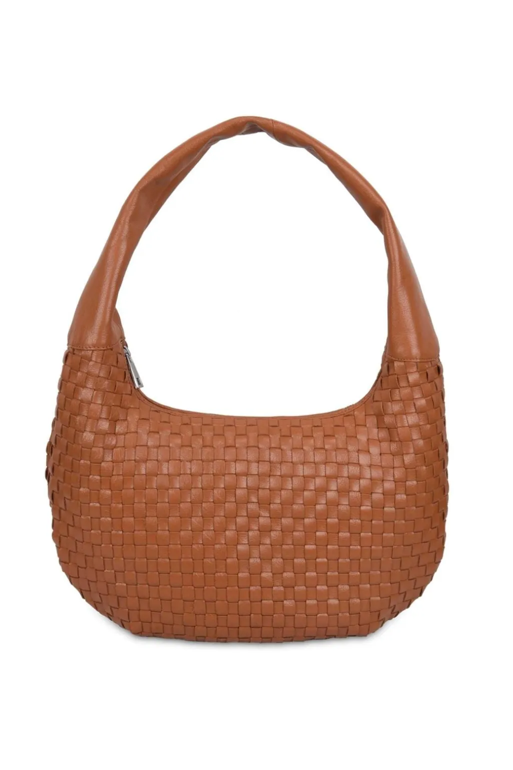 Håndtaske fra Núnoo i cognacfarvet læder med et flettet design. Tasken har en buet form og et karakteristisk mønster, der går igen over hele taskens overflade.