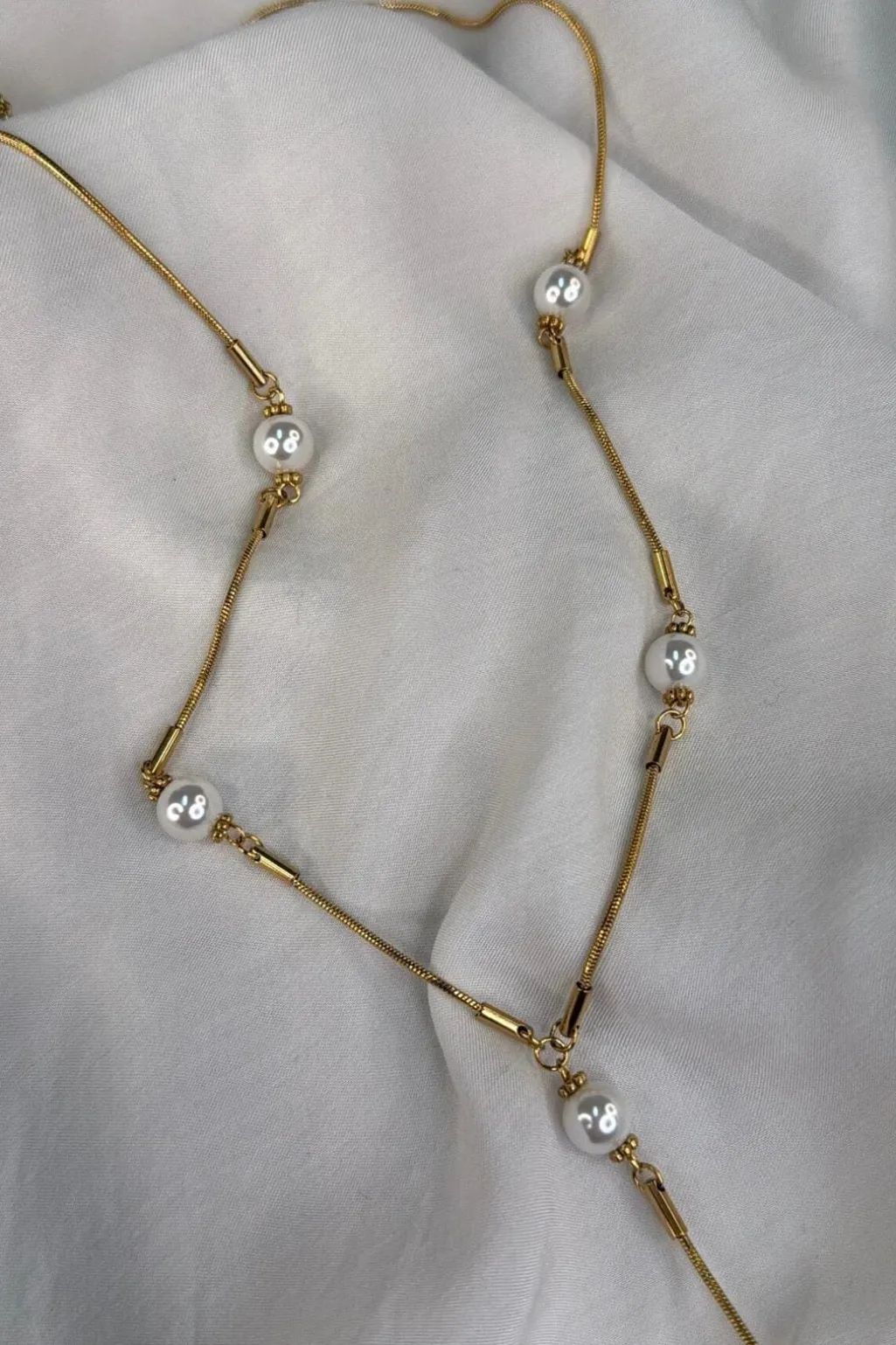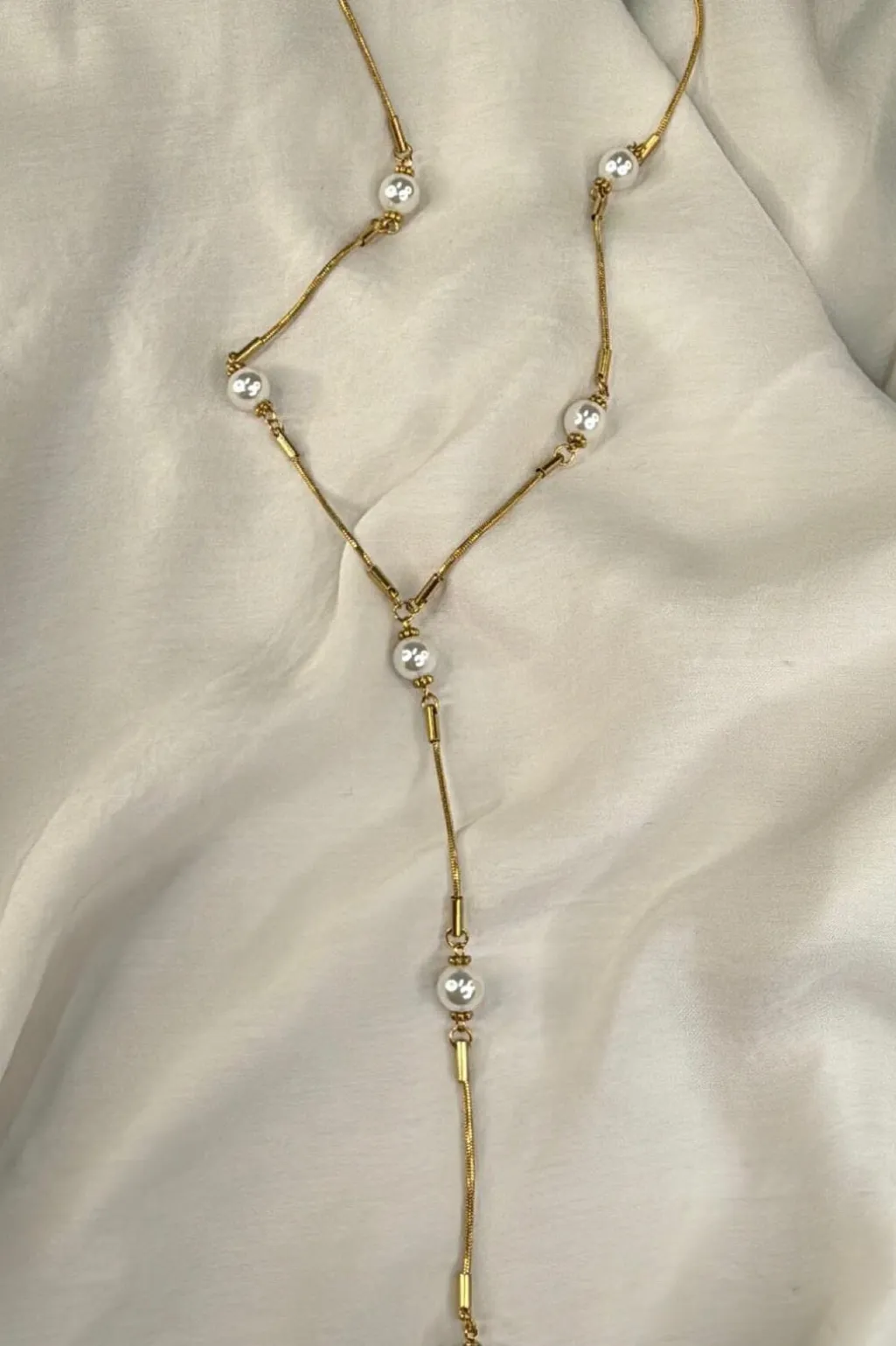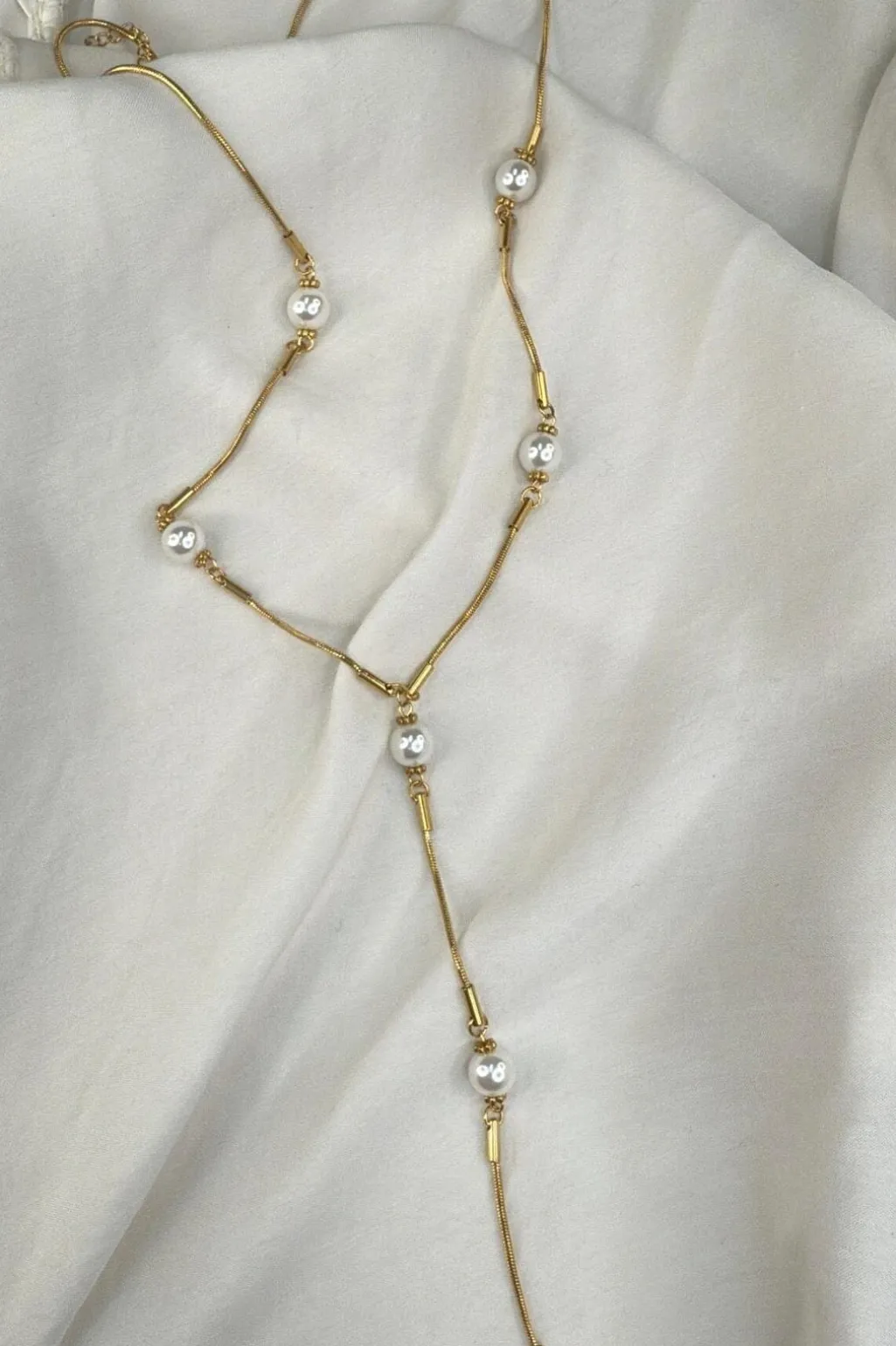 Et guldfarvet halskæde fra Molly&My Jewellery med et Y-formet design. Kæden har hvide perler og små cylindriske elementer fordelt langs kæden.