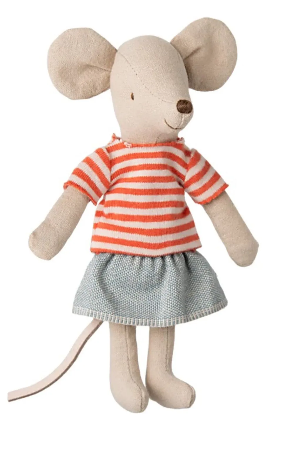 En blød legetøjsmus fra Maileg med rødstribet t-shirt og denimnederdel. Musen har magneter i hænderne og kommer i en dekorativ æske.