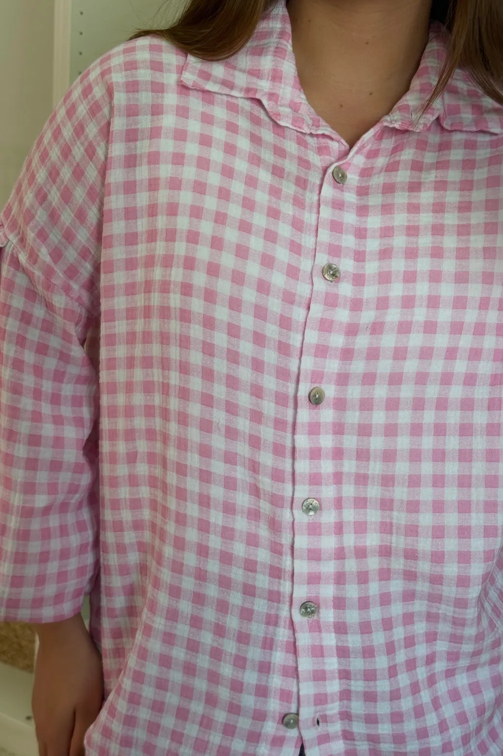 Ternet skjorte fra A-bee i pink og hvid. Skjorten har skjortekrave, knapper foran og perledetaljer. De brede 3/4-ærmer giver et afslappet look.