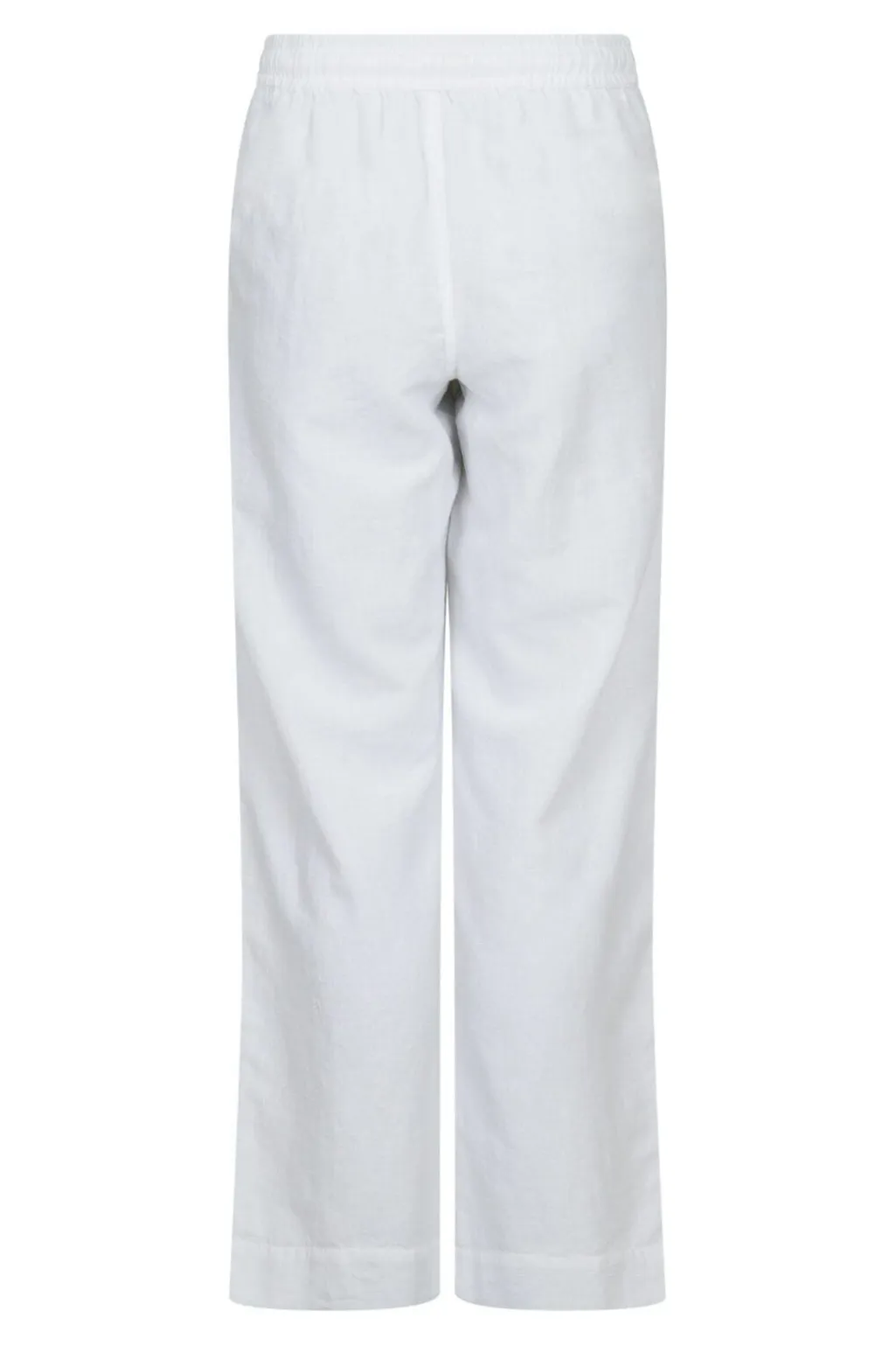 Hvide hørbukser fra Neo Noir med løs pasform og ankellængde. Bukserne har brede ben og en behagelig talje med elastik og bindebånd.