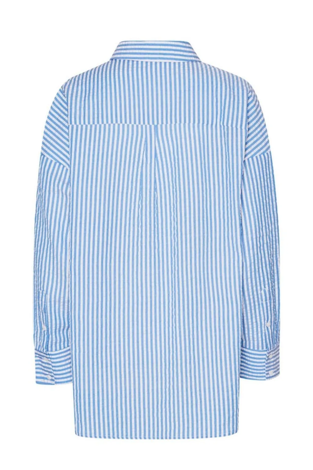 Stribet skjorte fra A-View i mørkeblå og hvid. Den har en oversize pasform med længere bagstykke og klassisk skjortekrave med knaplukning foran.