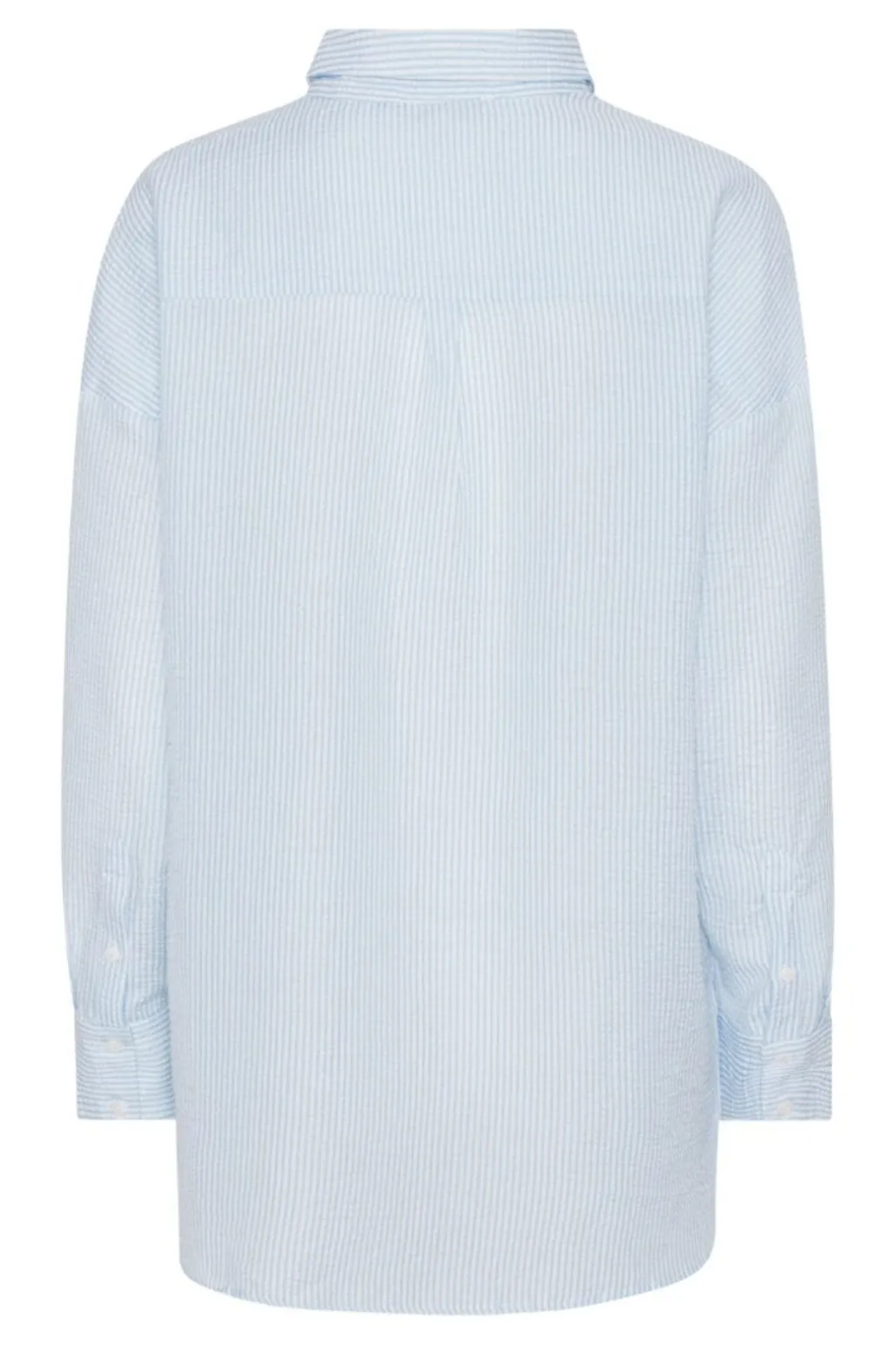 Stribet skjorte fra A-View med blå og hvide striber. Skjorten har en oversize pasform med lange ærmer, skjortekrave og knaplukning hele vejen ned.