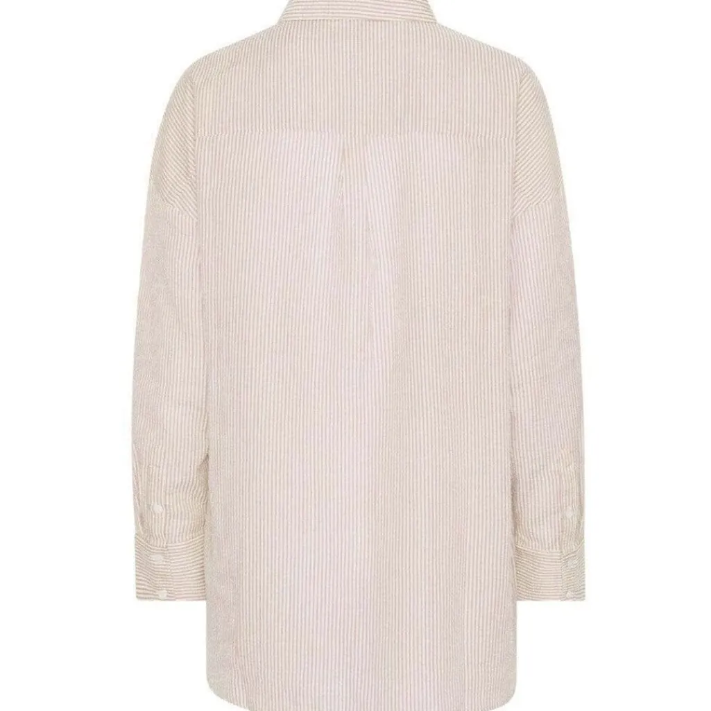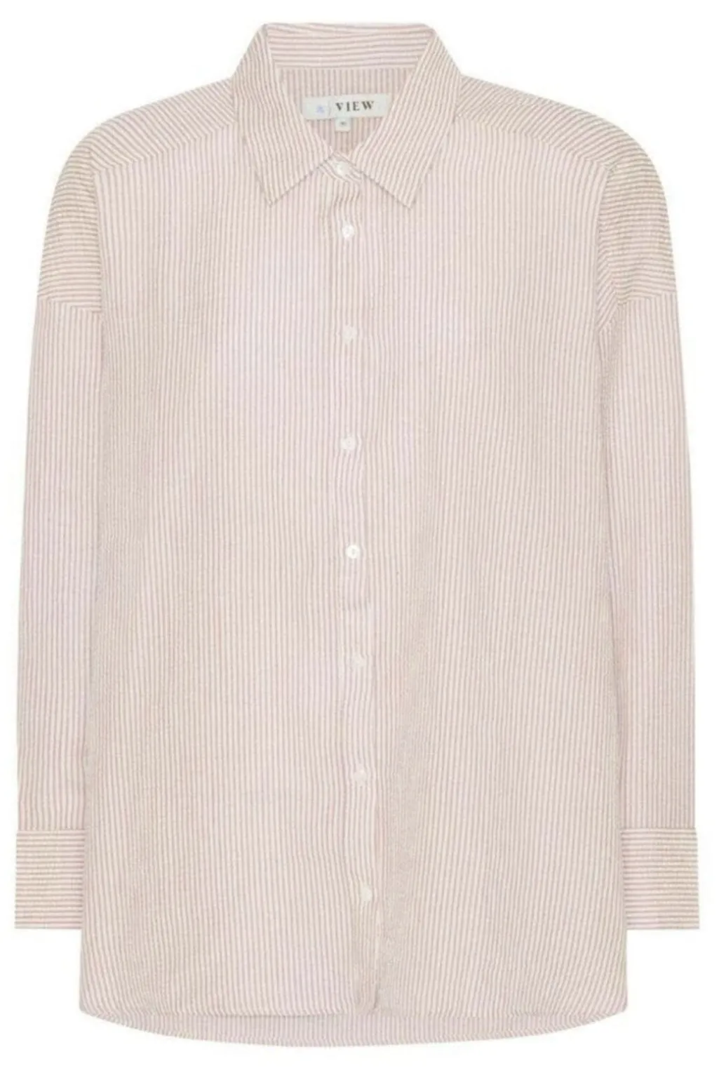 Stribet skjorte fra A-View i sand- og hvide nuancer. Skjorten har en oversize pasform med længere bagstykke og klassisk krave.