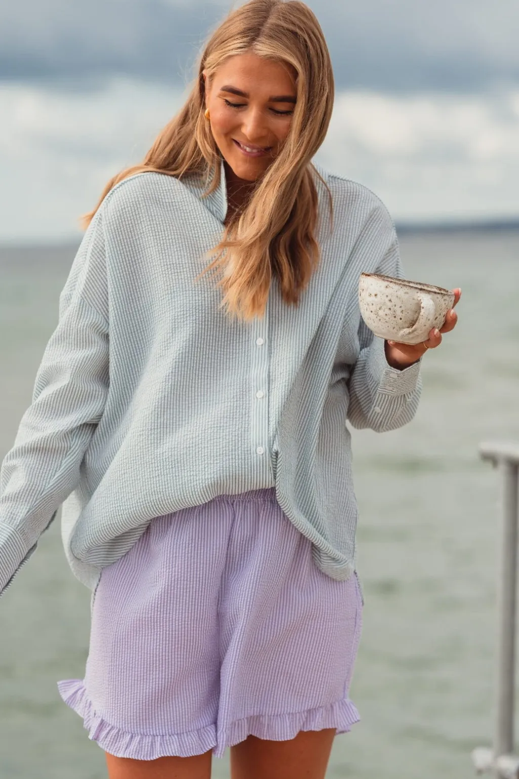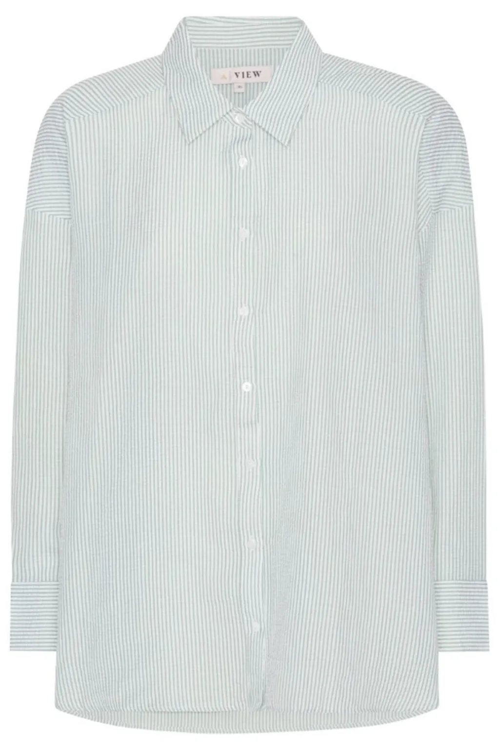 Stribet skjorte fra A-View i seersucker-kvalitet med grøn/hvidt mønster. Den oversized pasform med lave skuldersømme giver en afslappet silhuet.