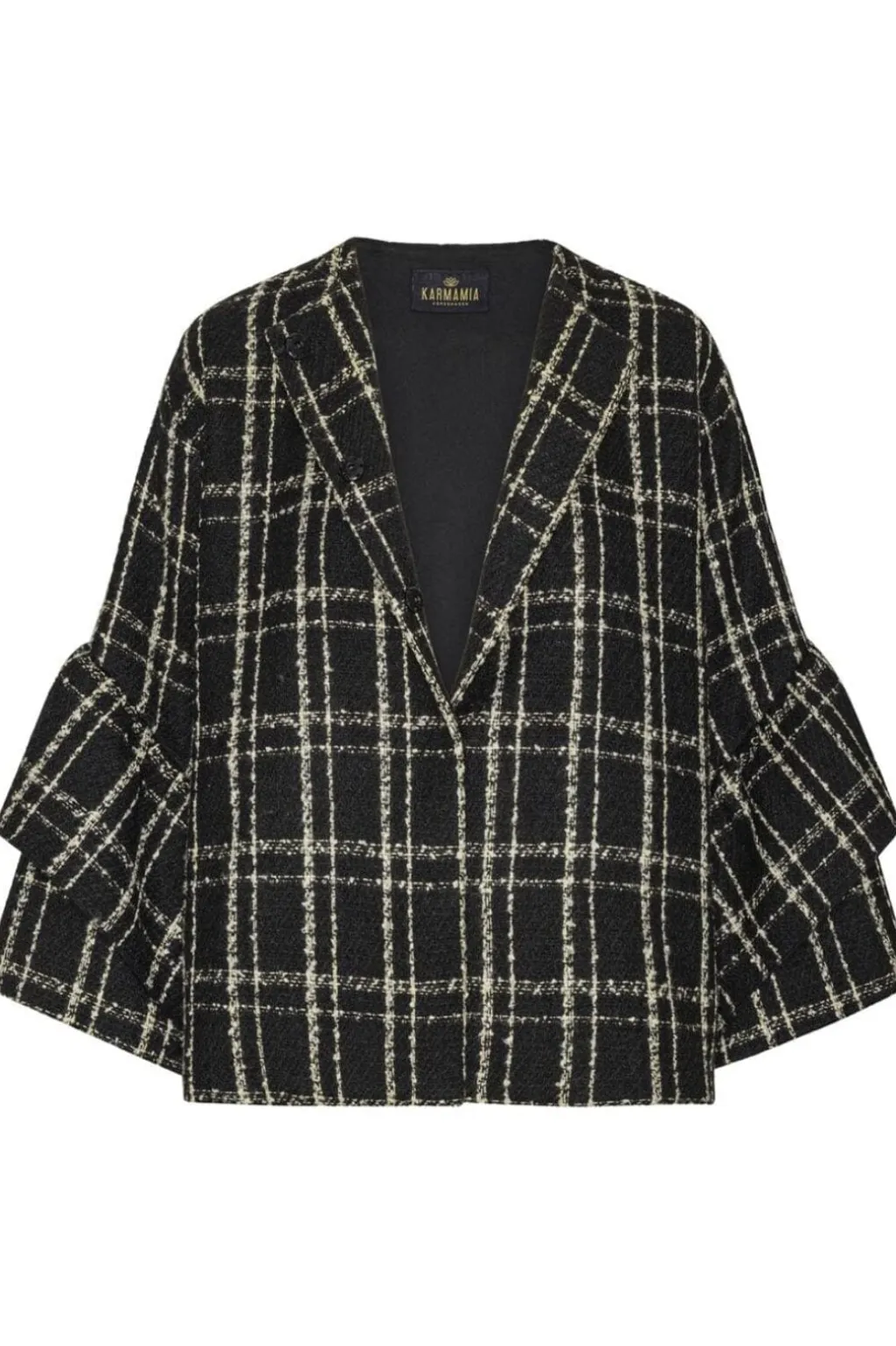 Sort jakke fra Karmamia med et sort-hvidt ternet mønster. Jakken har en V-halsudskæring, 3/4 ærmer og knapper foran. Praktiske lommer giver plads til småting.