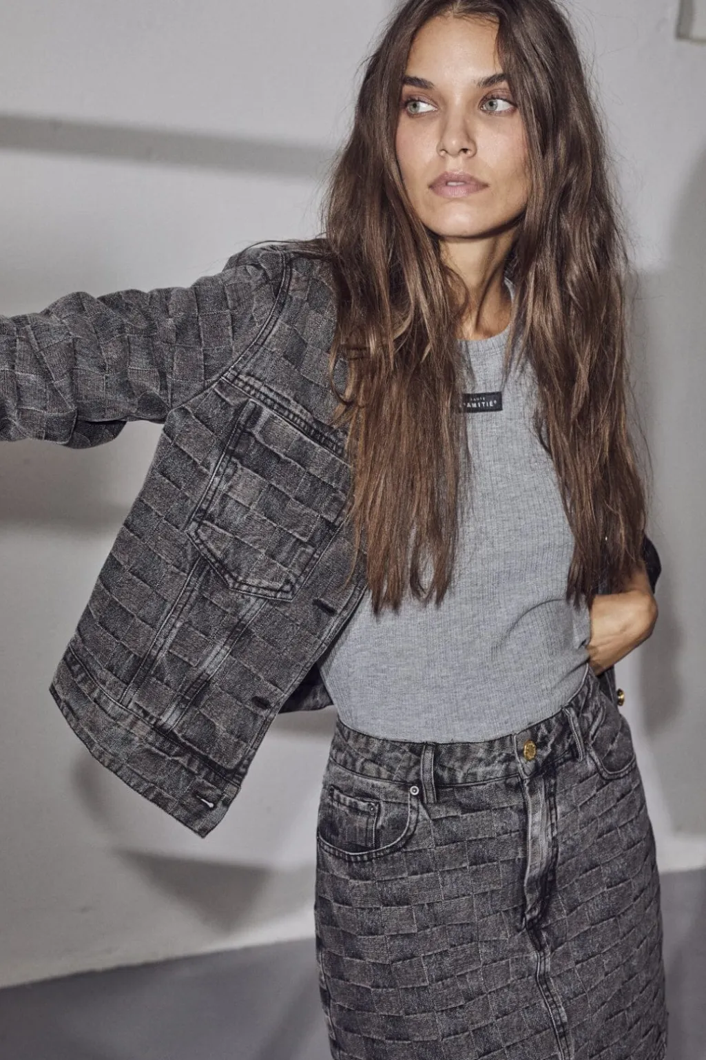 Sort denimnederdel fra Haute L’Amitié i et kvadratisk mønster. Nederdelen er lavet af denim og har en kort længde, der slutter ved låret.