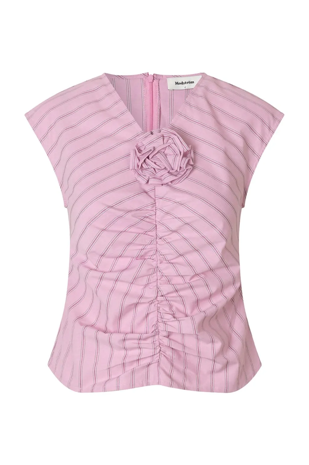 Lyserød stribet top fra Modström med V-hals og korte ærmer. Toppen har en slank pasform og er designet med flæser og rynker samt en dekorativ blomst foran.