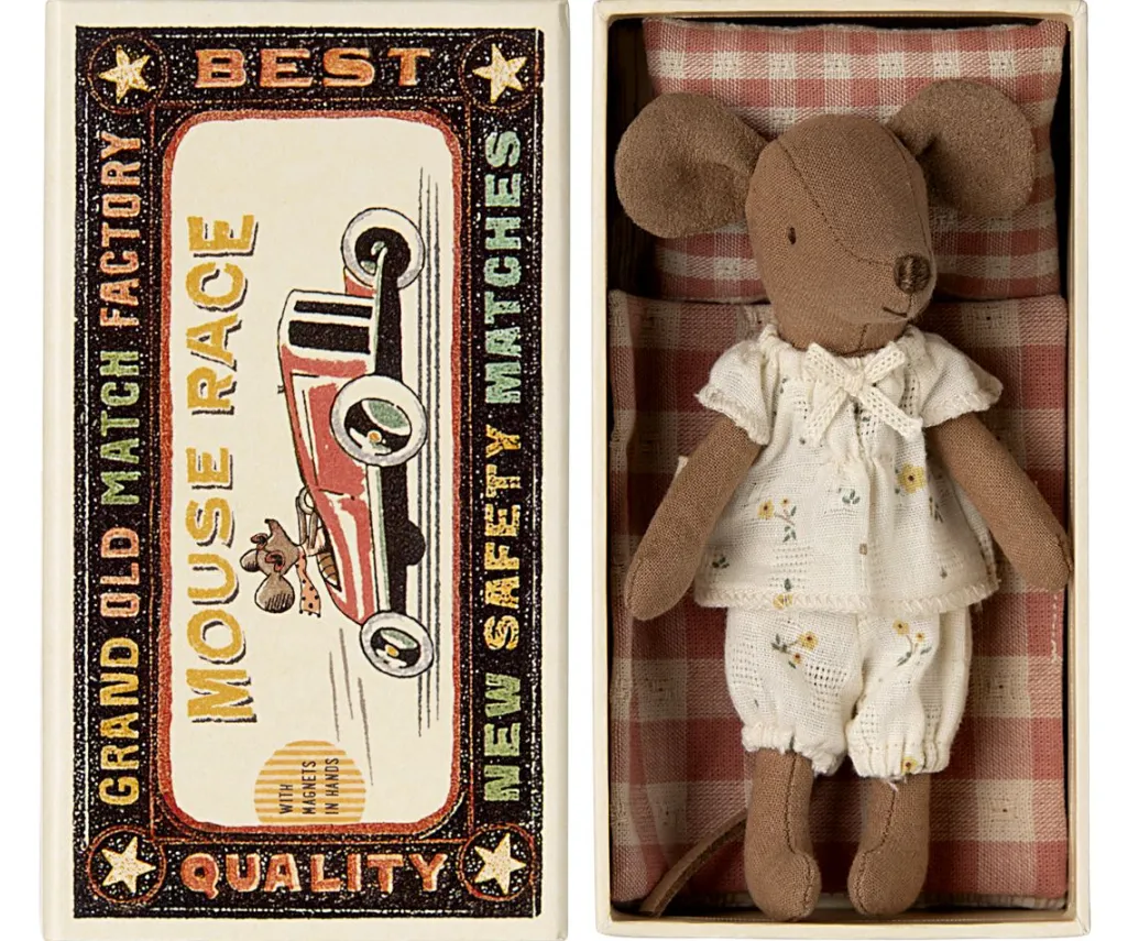 En klassisk Maileg-vare. Denne mus er klar til timevis af leg og sover godt i tændstikæsken. Tøjet og sengetøjet kommer i unikke mønstre og smukke farver.