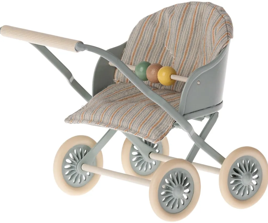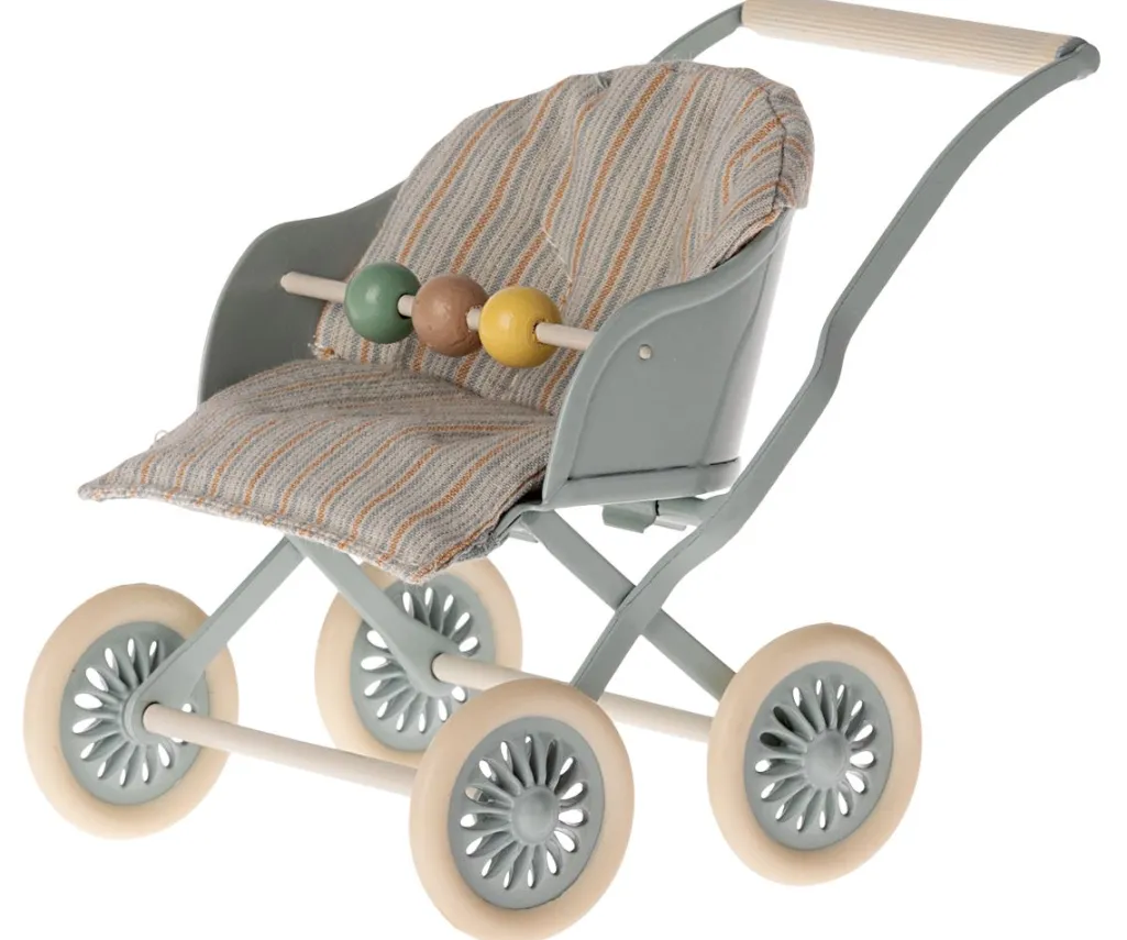 Blå dukkevogn fra Maileg med stribet stofsæde og lysegrå metalramme. Vognen har dekorative hjul med blød kant og et træperle-legetøj fastgjort til fronten.