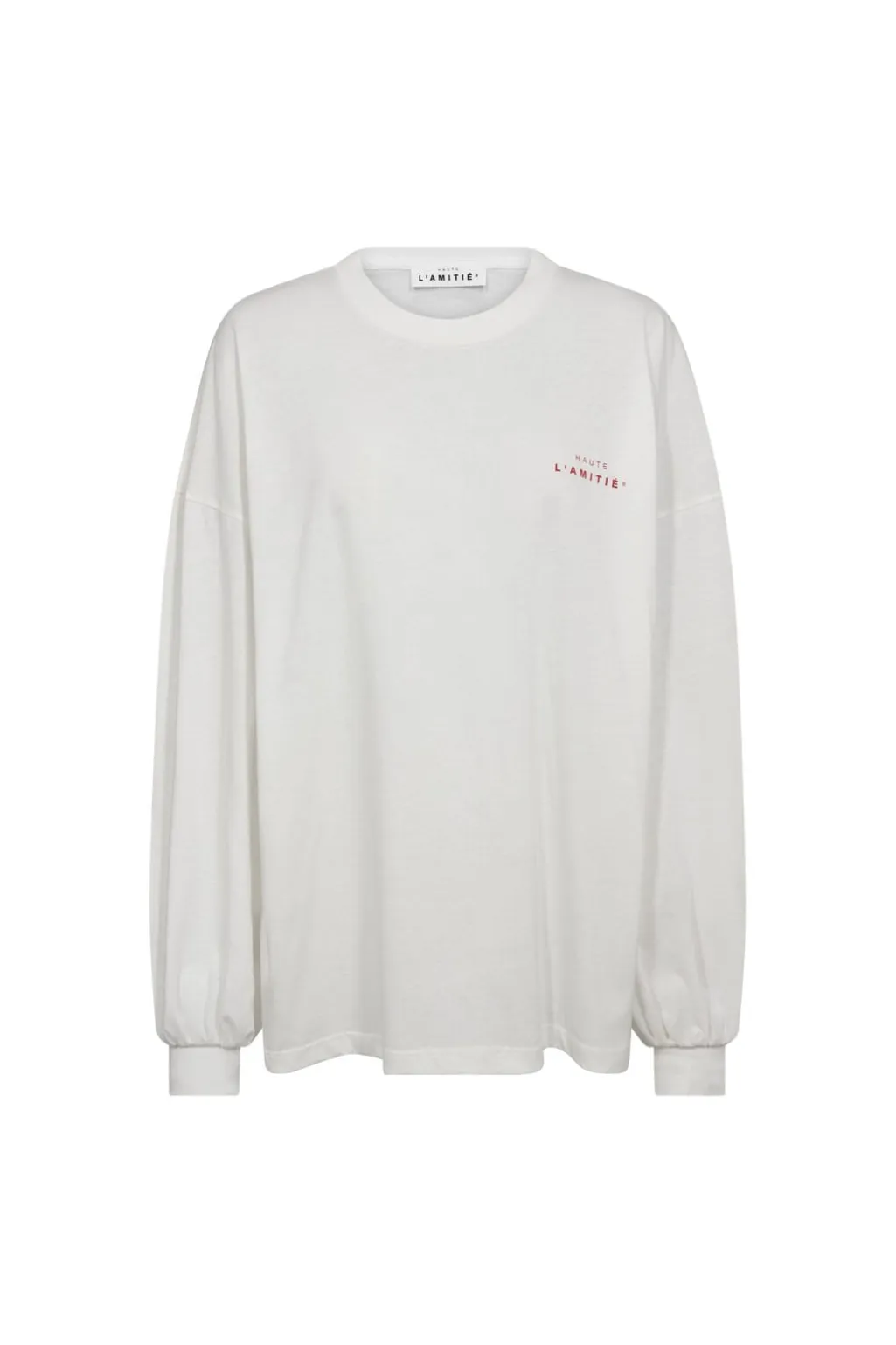 Langærmet T-shirt fra Haute L’Amitié i en cremefarvet nuance. T-shirten har et lille tryk på brystet med brandets navn.