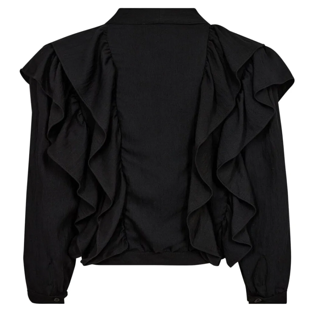 Sort bluse fra Co´couture med store flæser langs for- og bagside. Blusen har en dyb V-udskæring og lange ærmer med manchetter. Den har knapper som lukning.