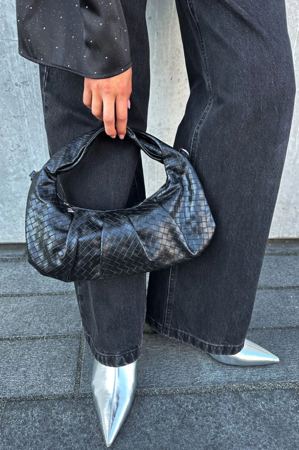 Sort taske fra Noella med flettet mønster i kunstlæder. Den rummelige taske har et karakteristisk design med et gennemgående flettet mønster på overfladen.