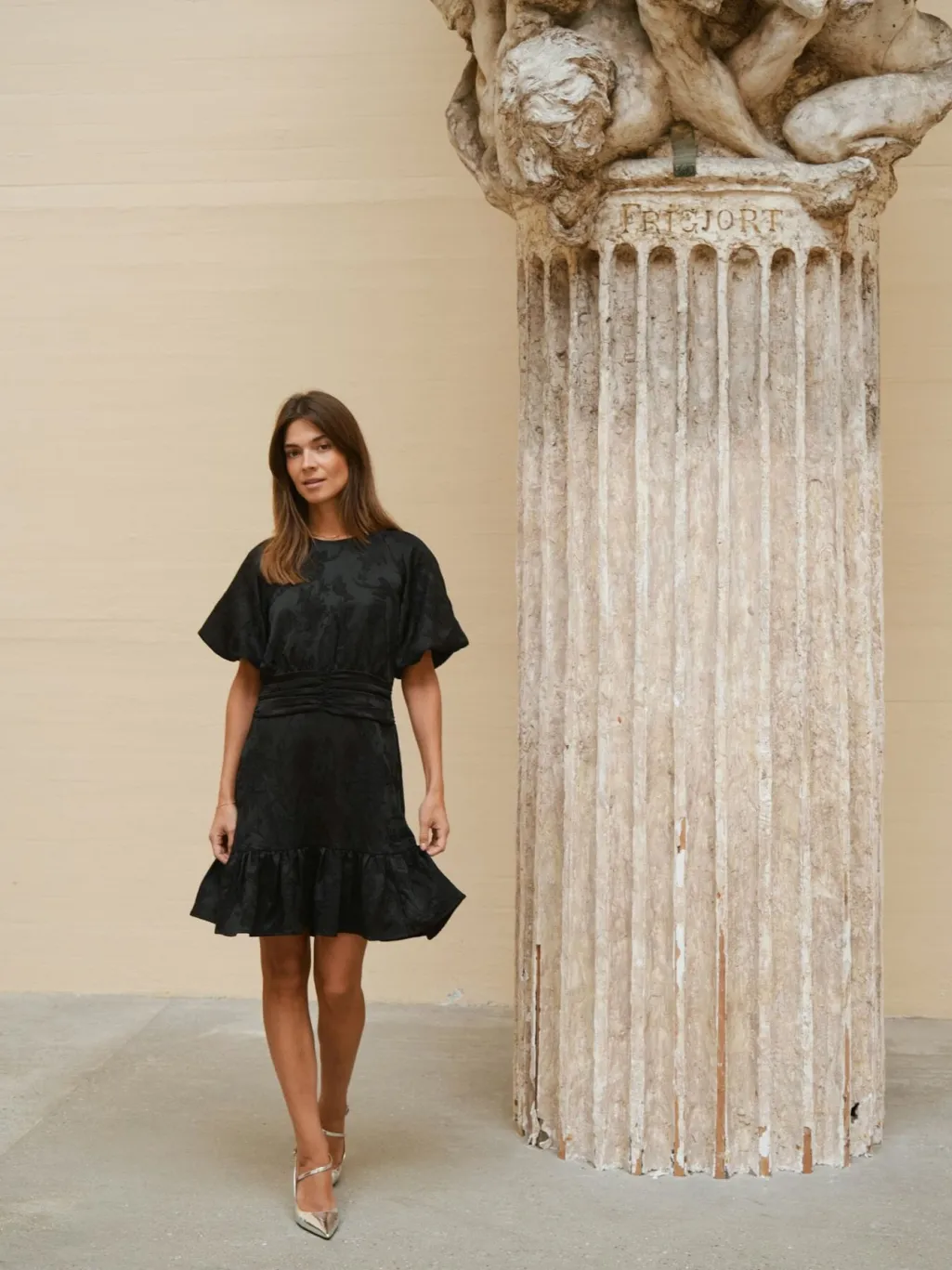 Sort jacquardkjole fra Neo Noir med blomstermønster. Kjolen har 3/4-ærmer med elastik, bånd i taljen og går til knæet. Flæsekanter og pyntesyninger giver kjolen et feminint udtryk.
